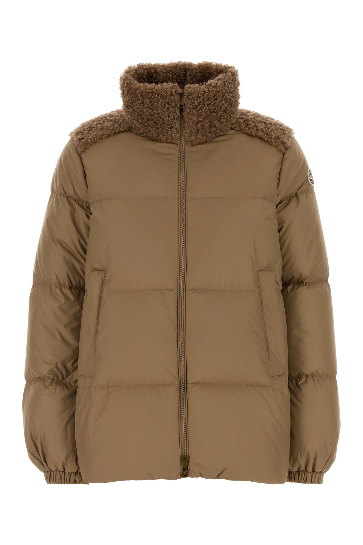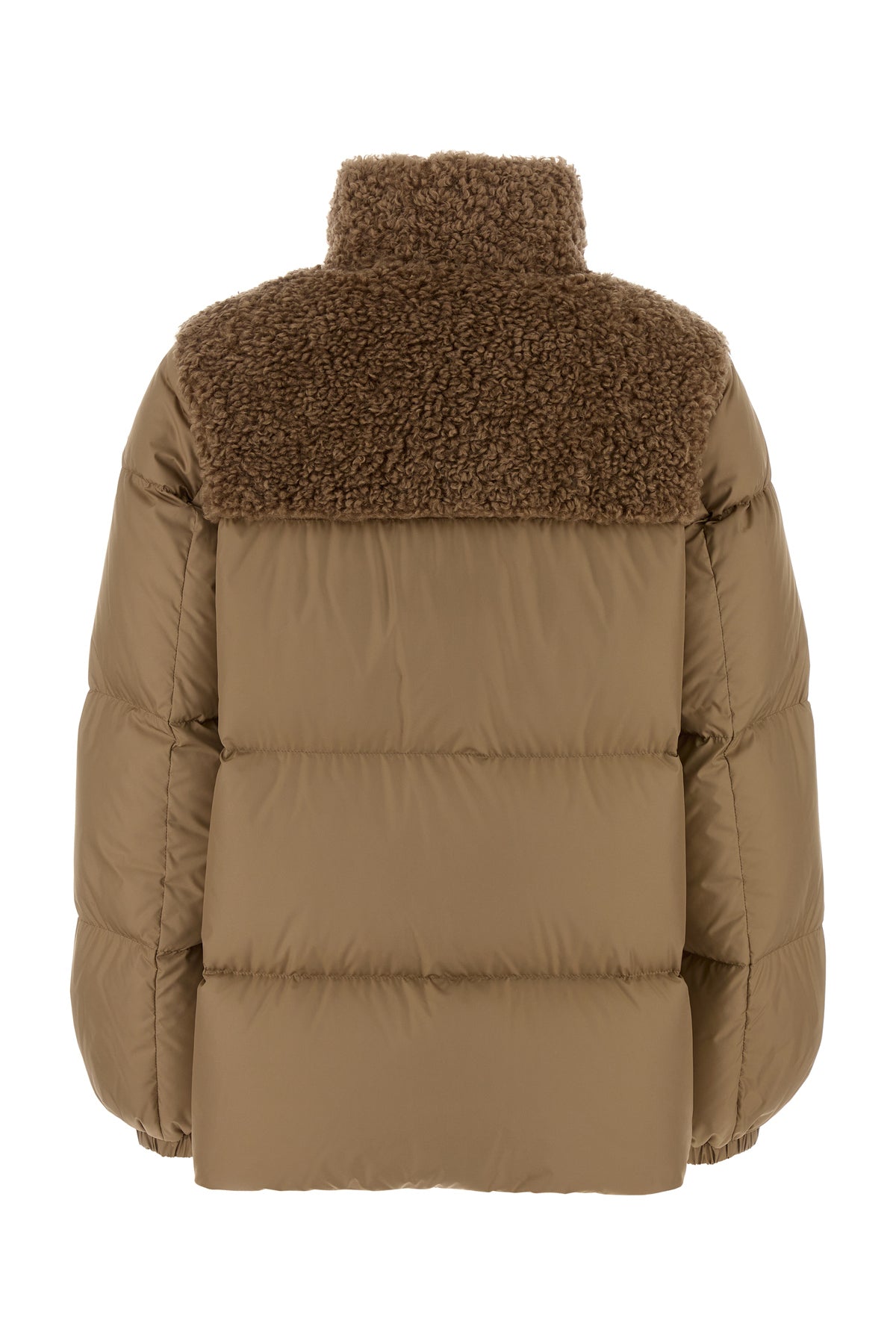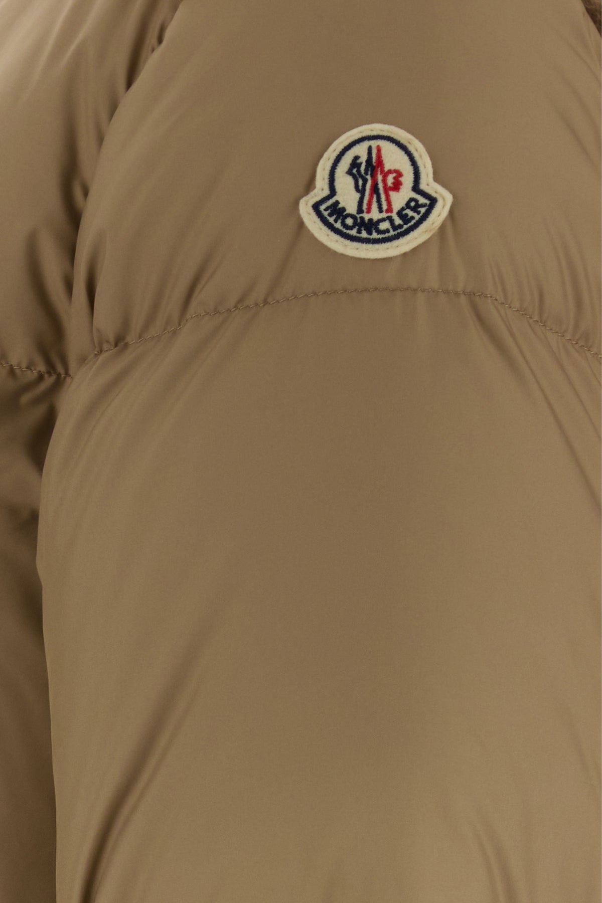 Down jacket realized in quilted polyester enriched by contrasting logoed patch on the sleeve.