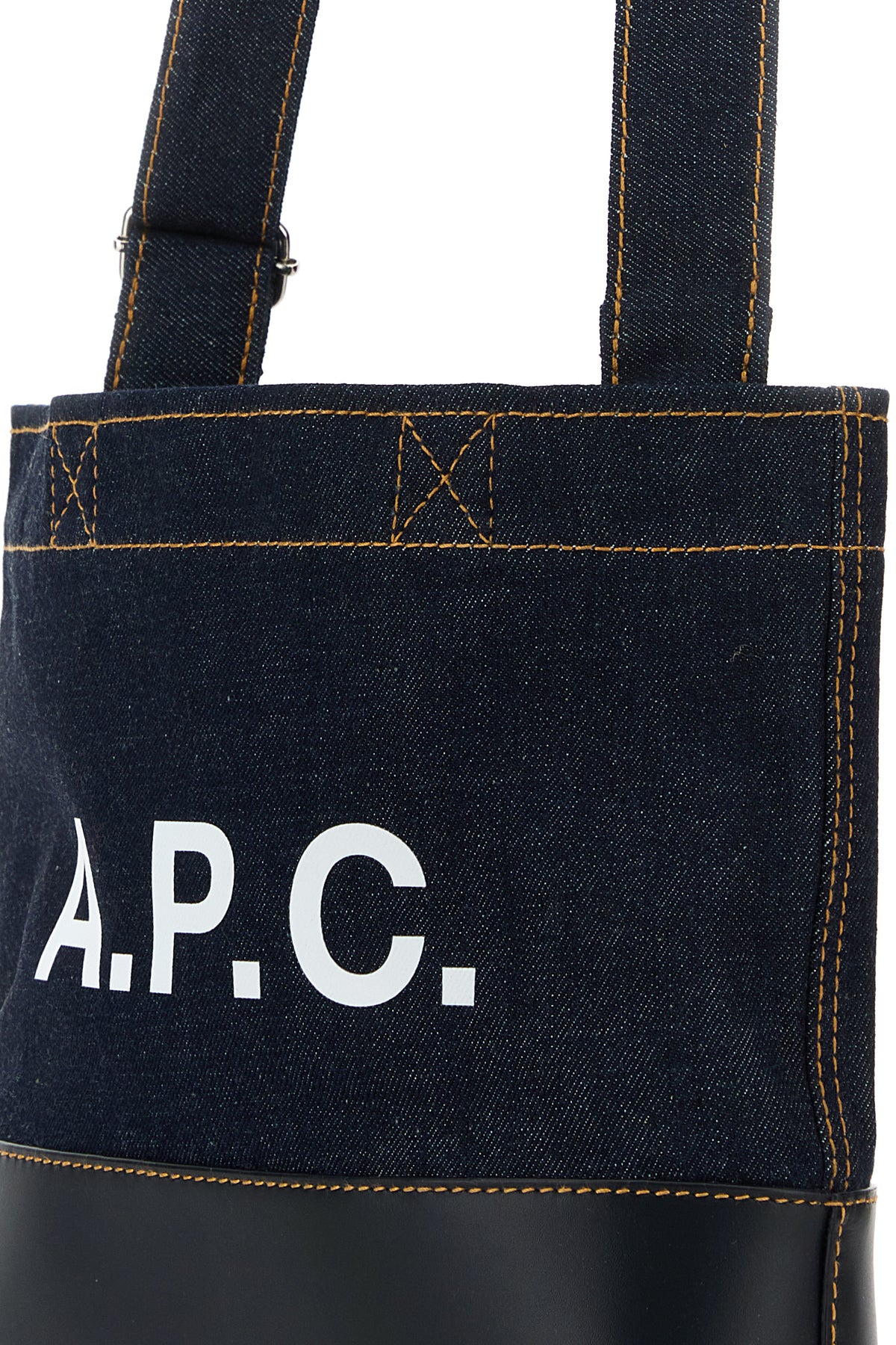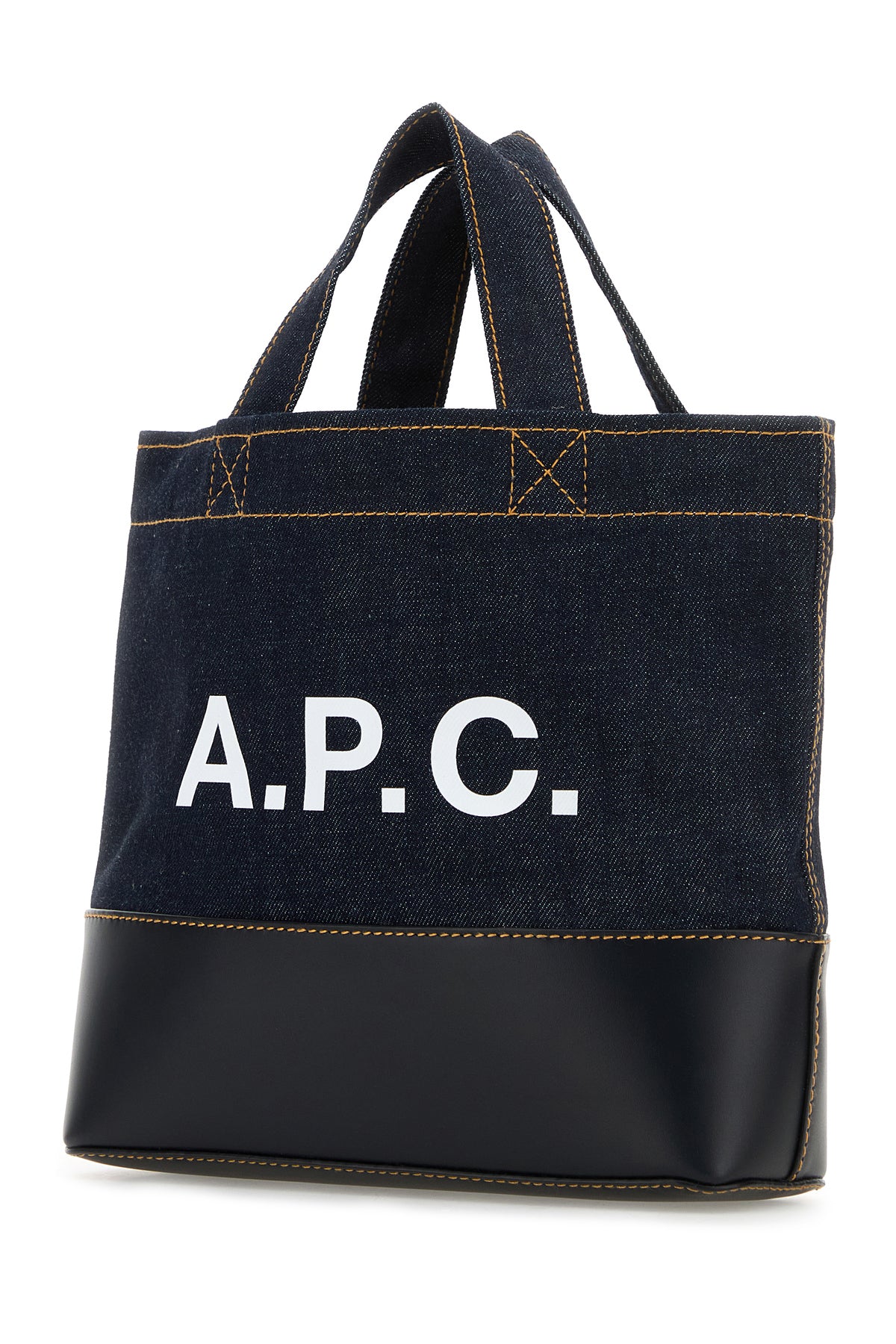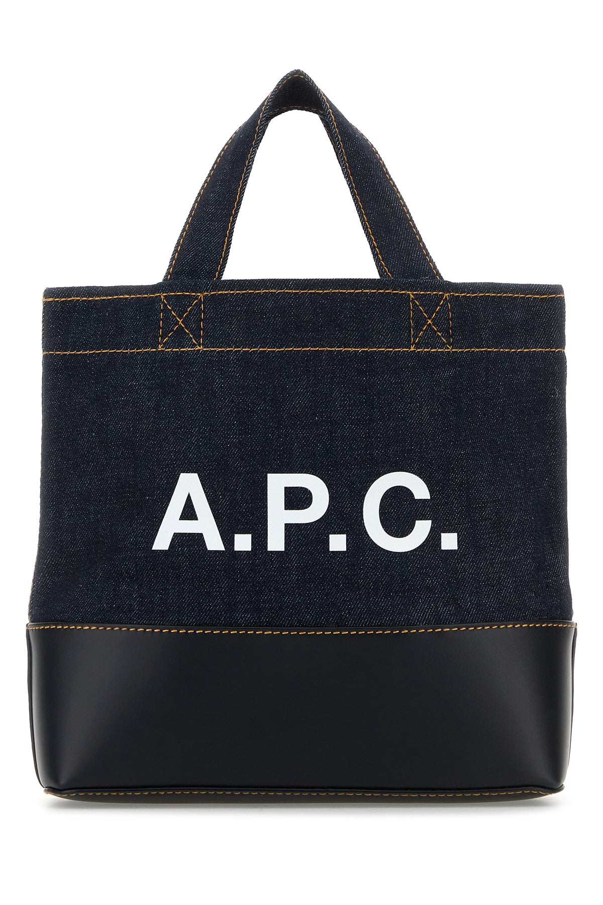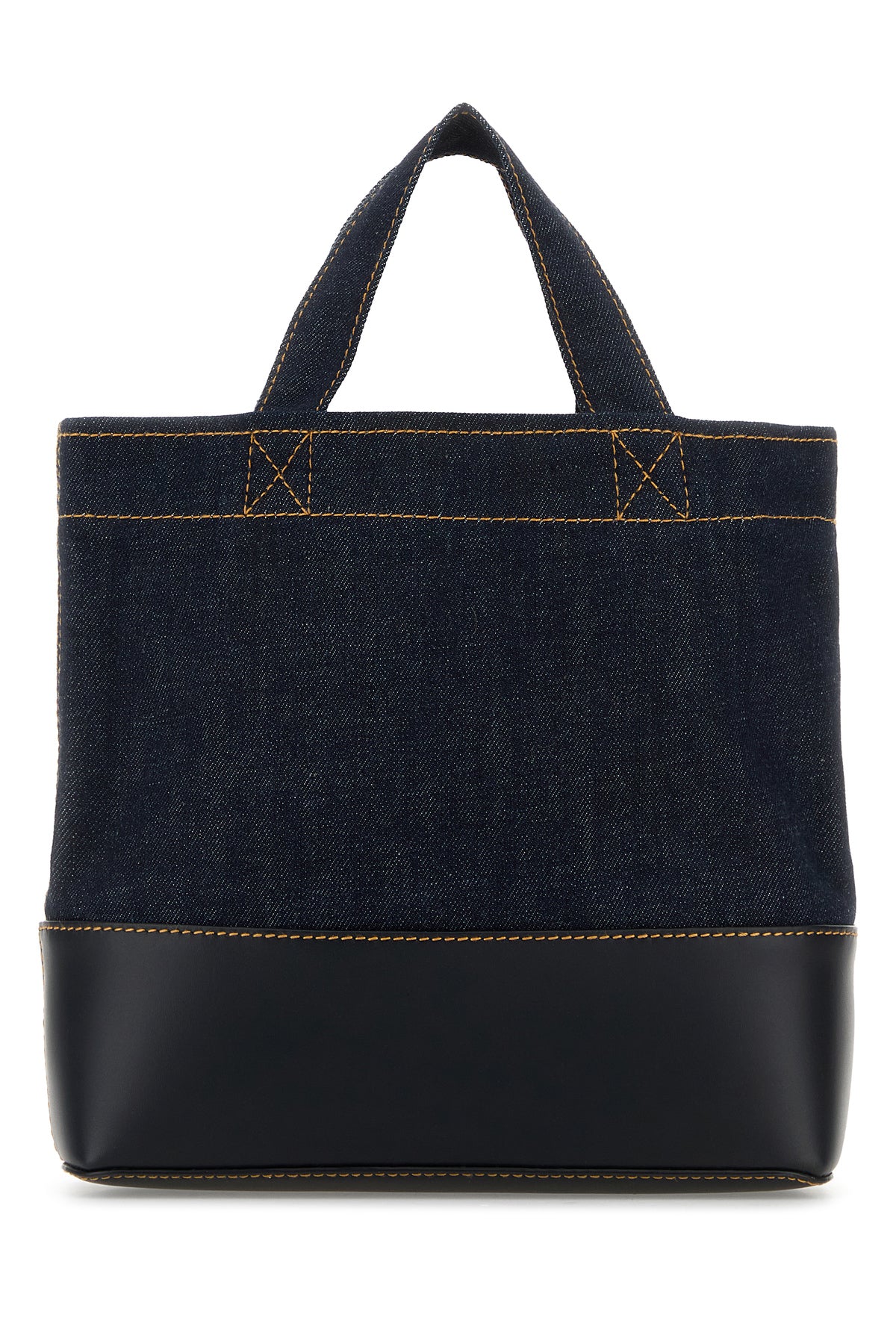 Shopping bag realized in denim with leather insert on the hemline characterized by contrasting printed logo at the front.