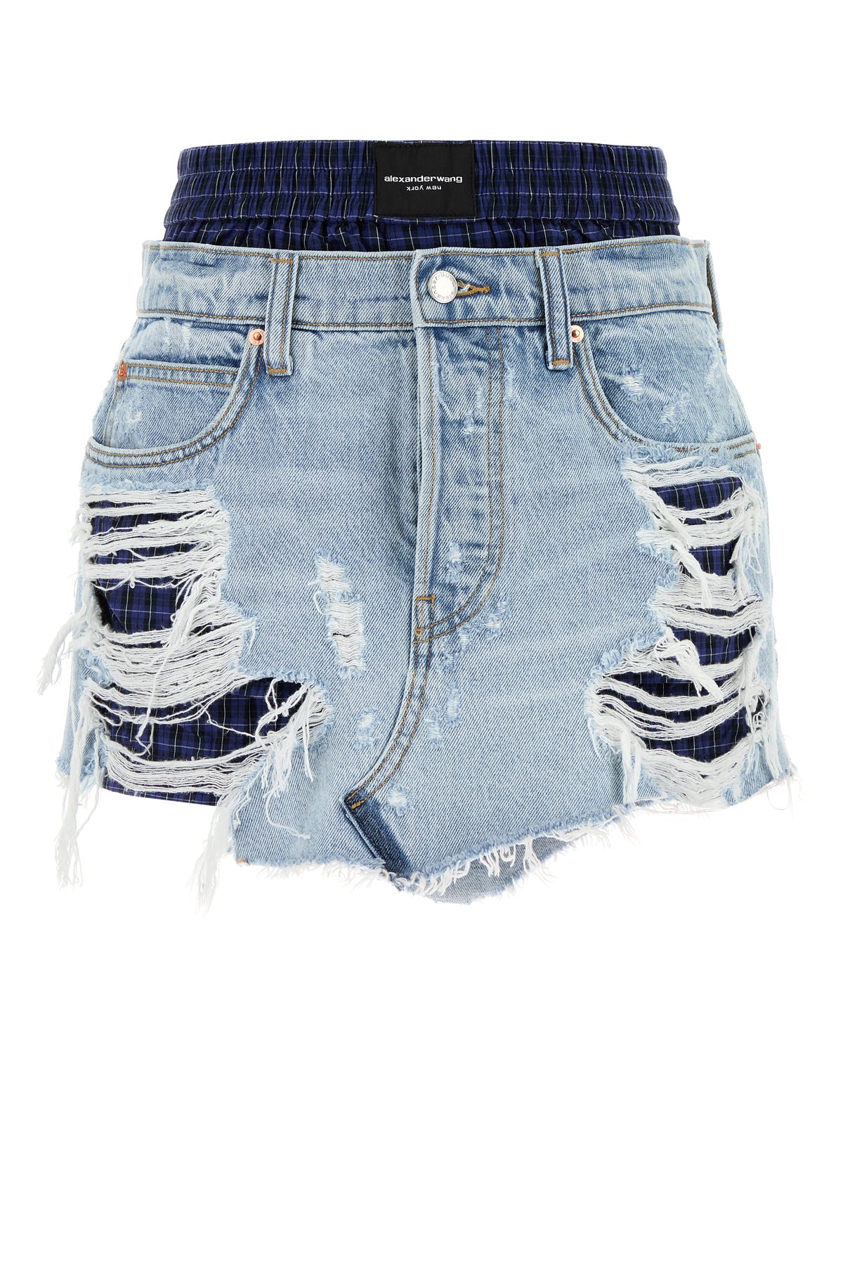 Layered pant-skirt realized in stonewashed and distressed pure cotton denim characterize by rips at the front and at the back.