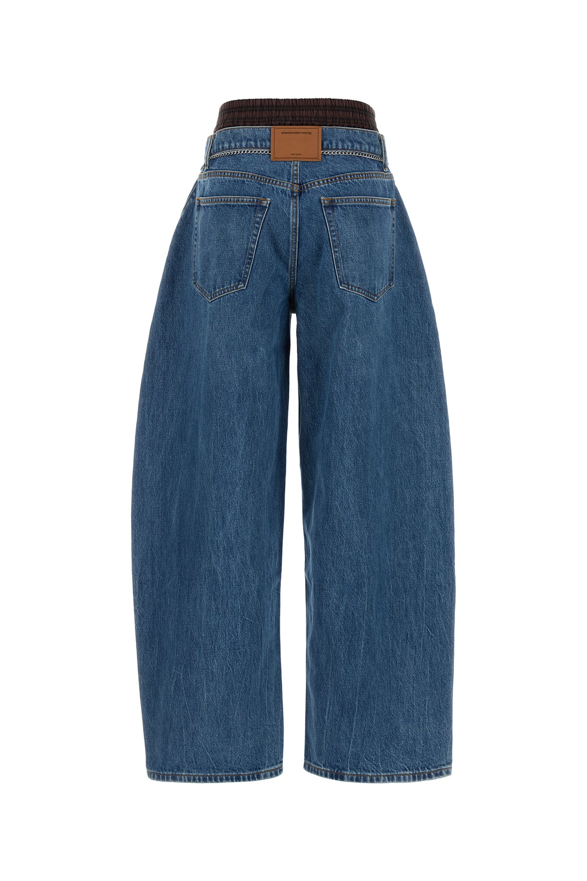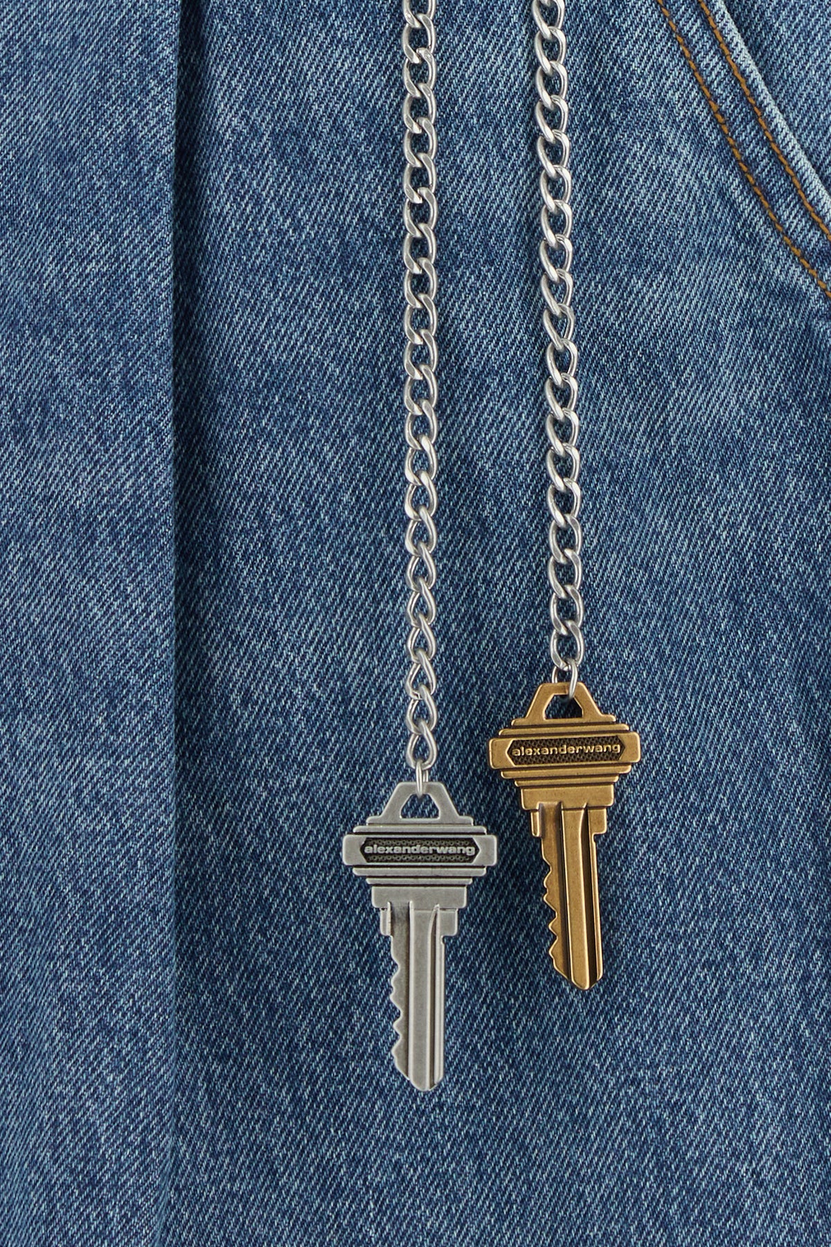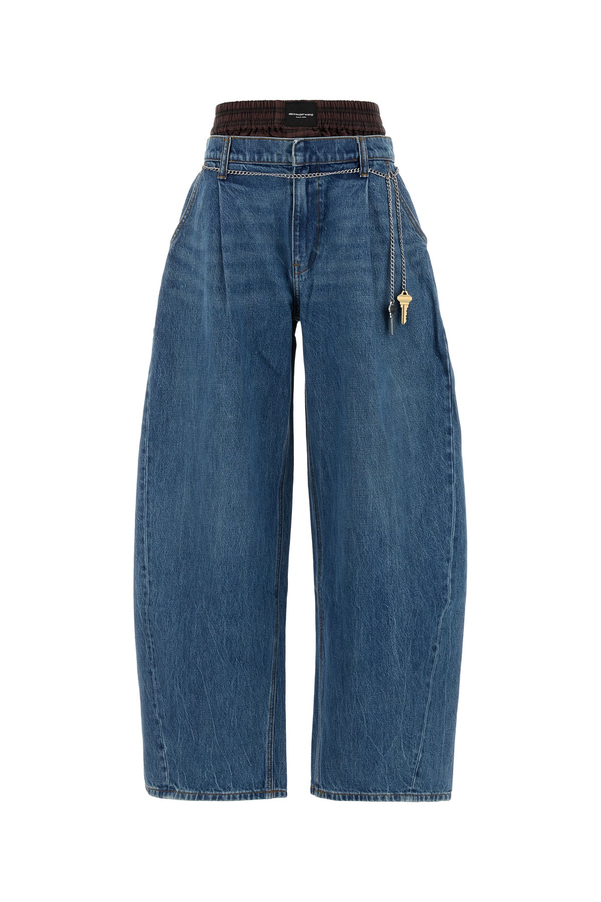Wide-leg jeans realized in stonewashed pure cotton denim enriched by tartan motif poplin insert with logoed label and detachable metal chain belt with Keys charms.