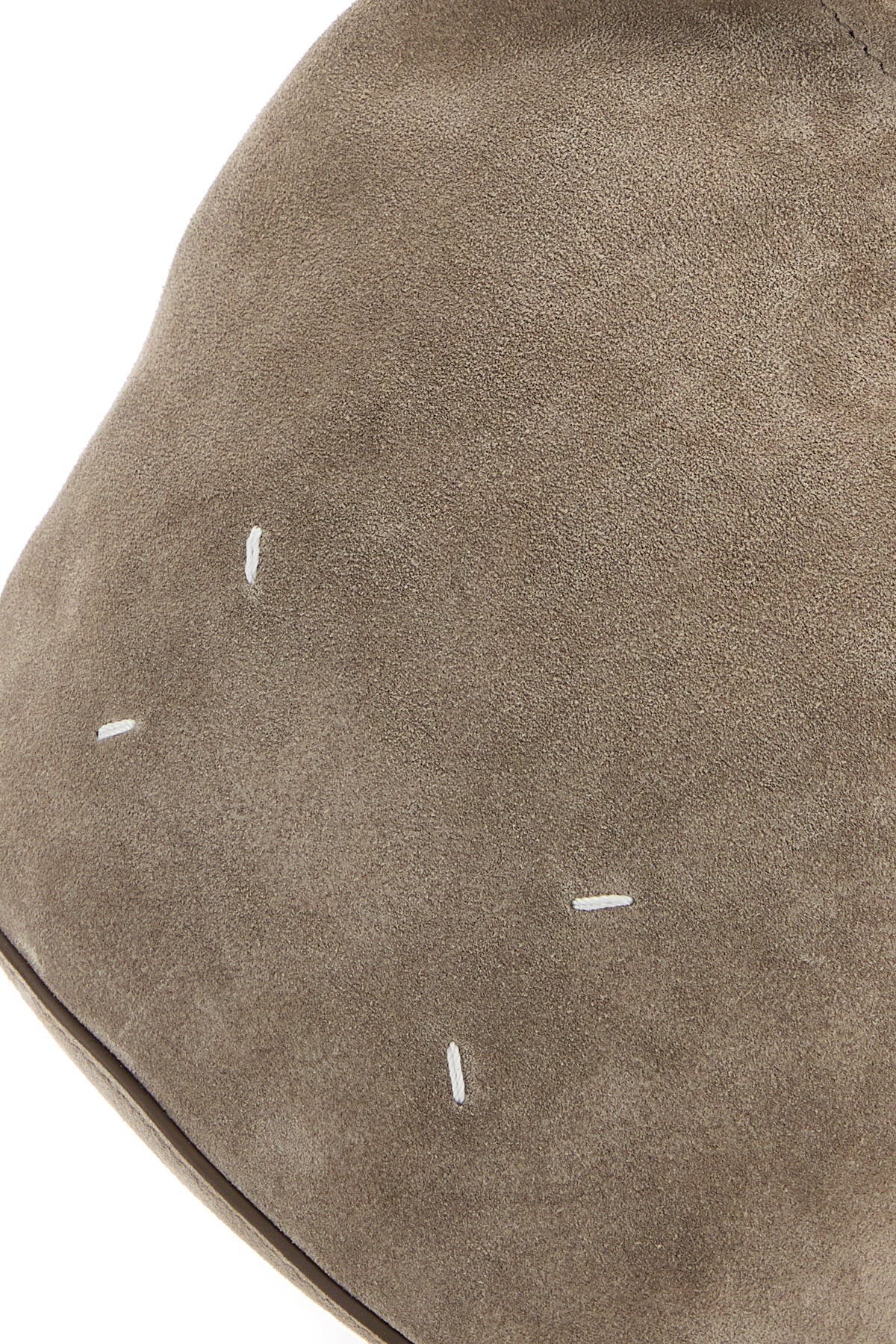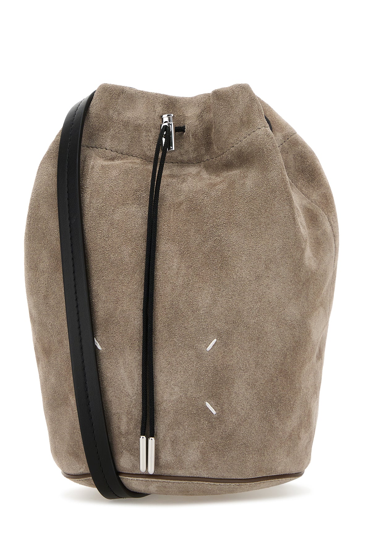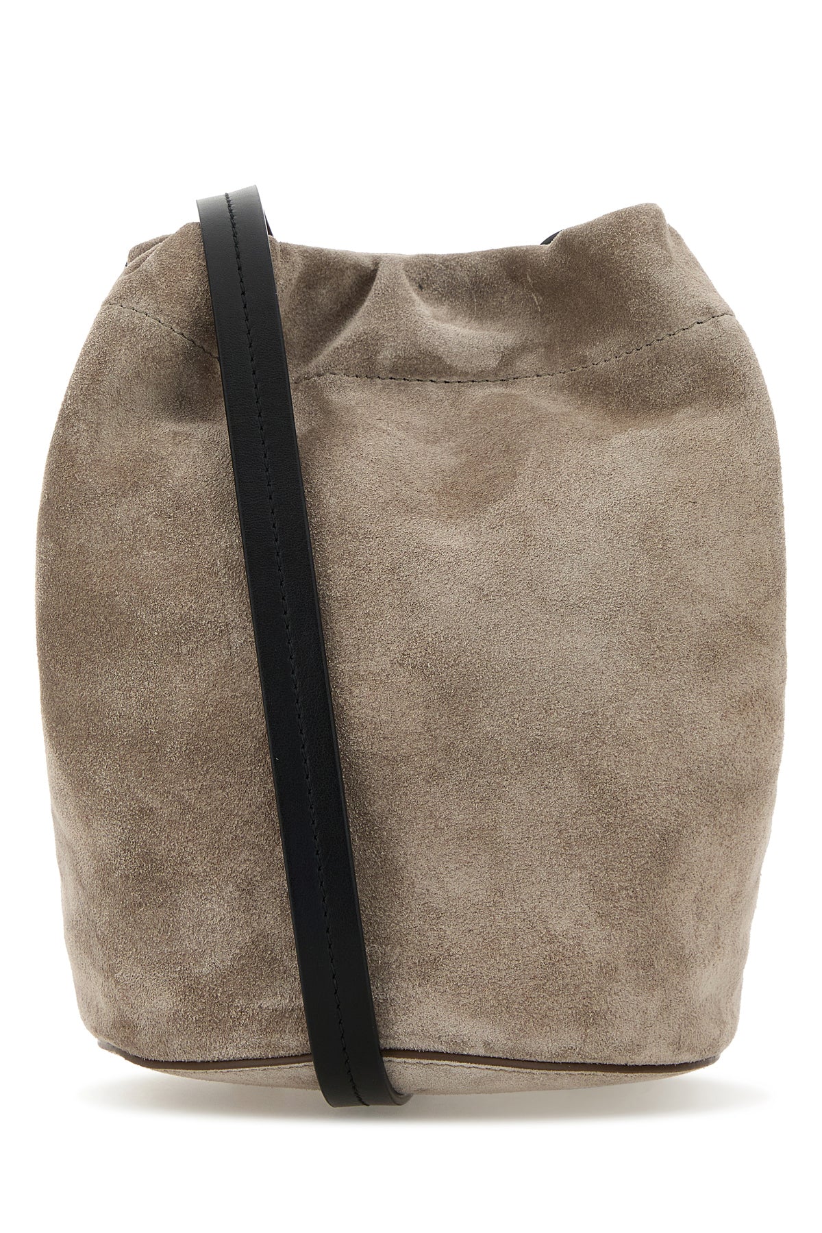 Bucket bag realized in suede characterized by iconic contrasting stitching at the front.