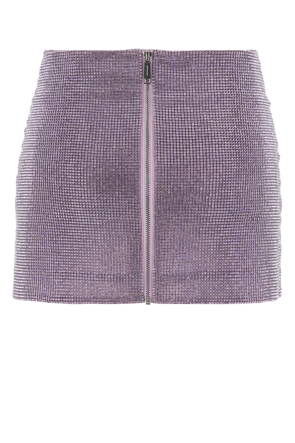 Mini skirt realized in fabric entirely covered by rhinestones.
