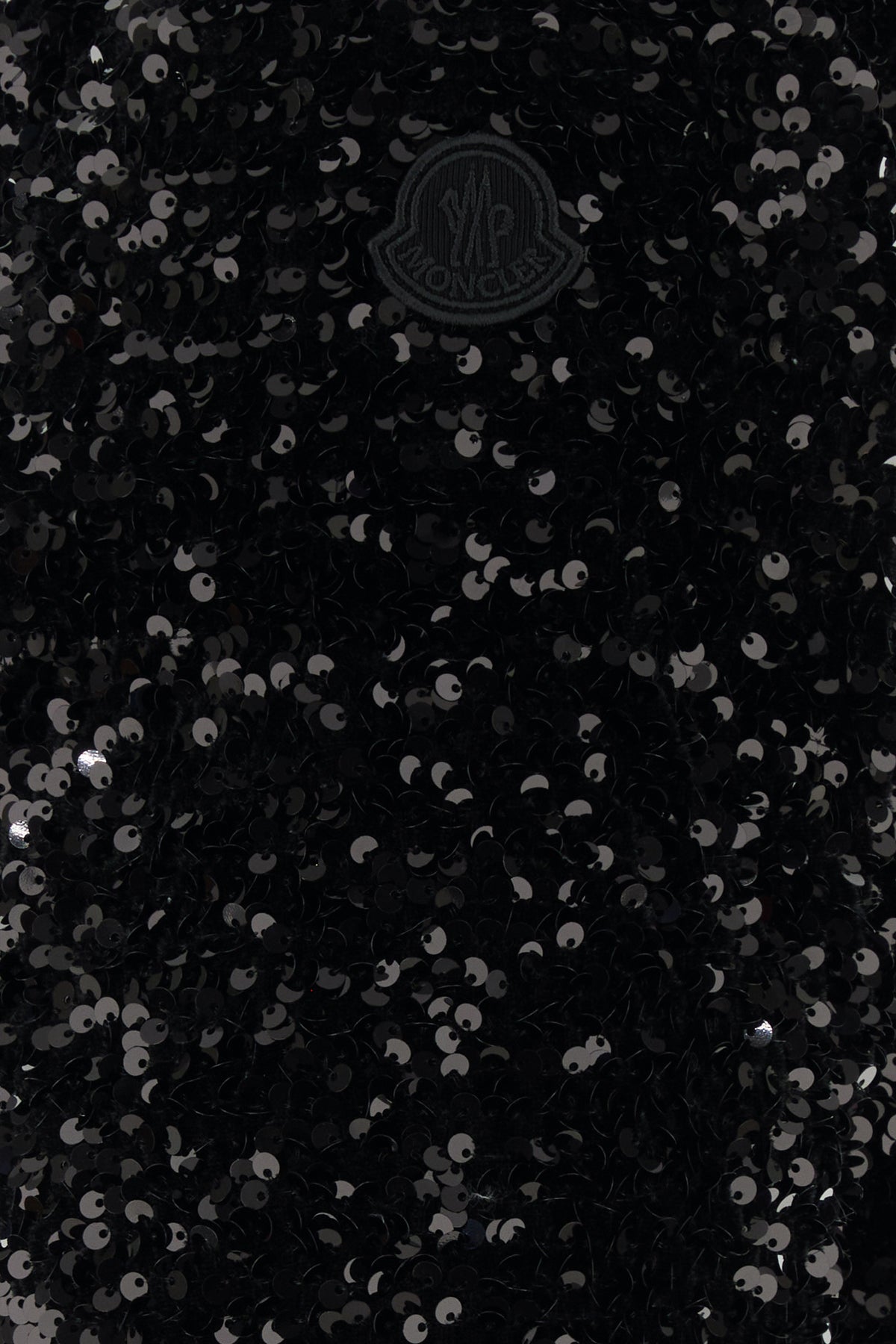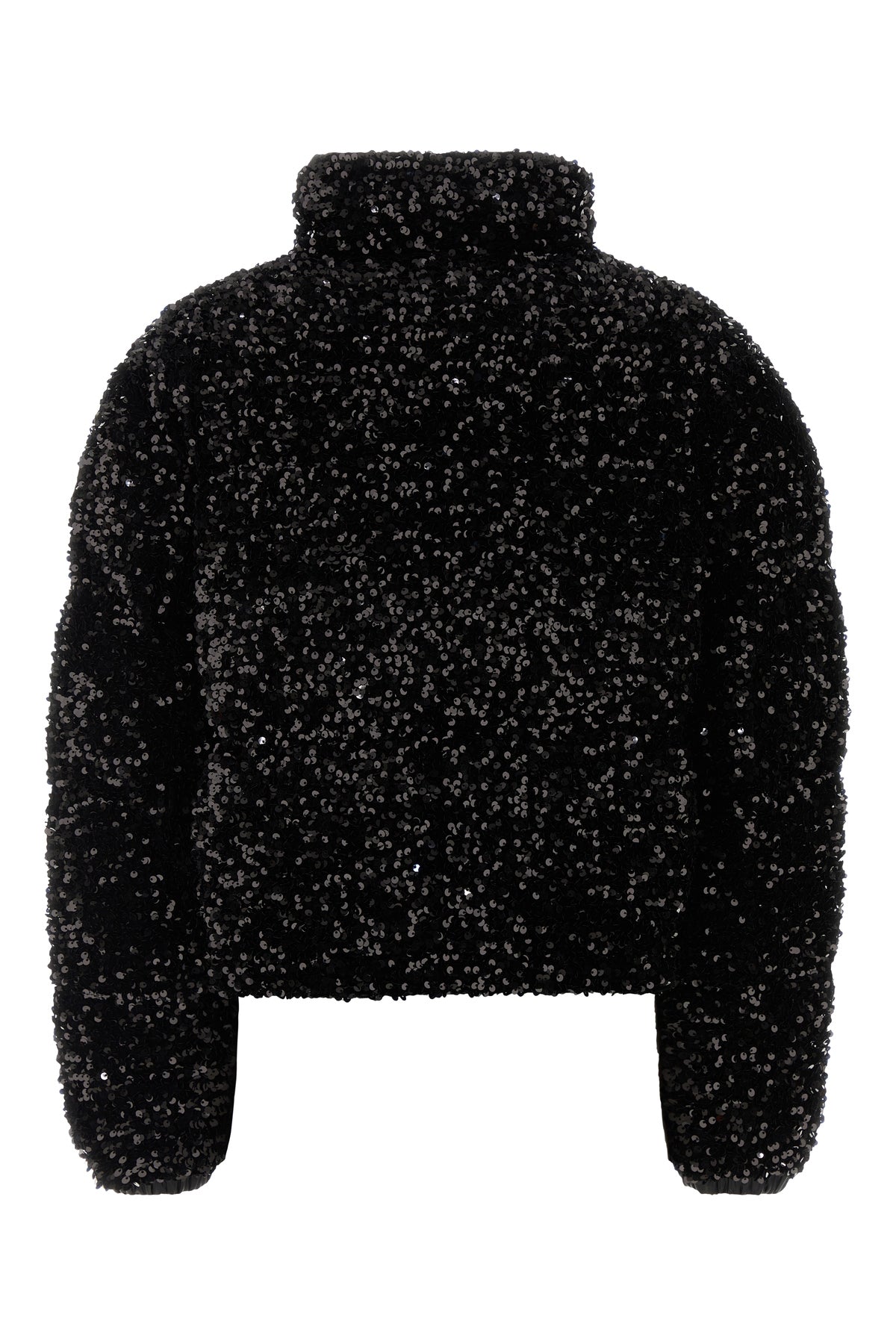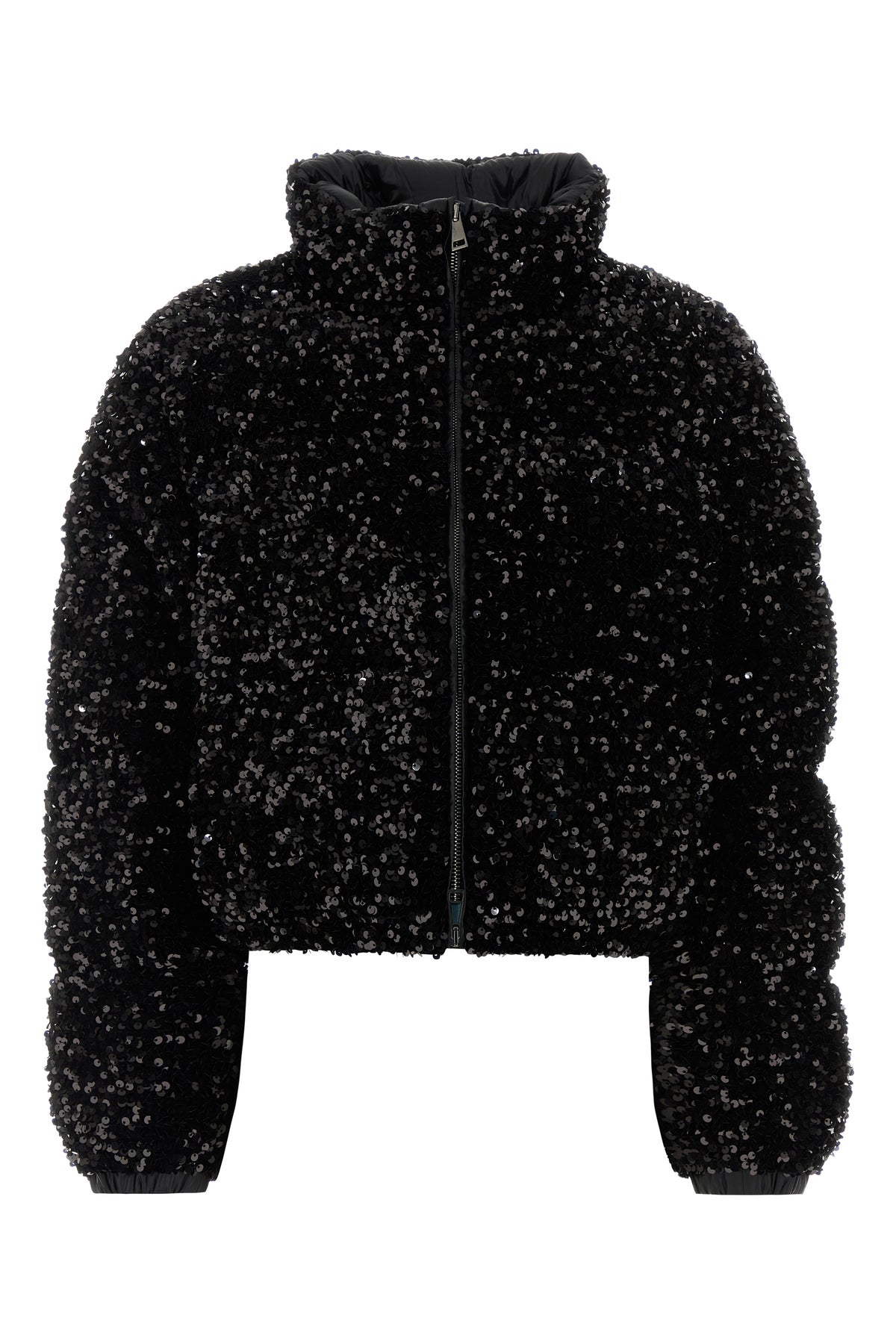 Down jacket realized in quilted polyester entirely covered by sequins enriched by logoed patch on the sleeve.