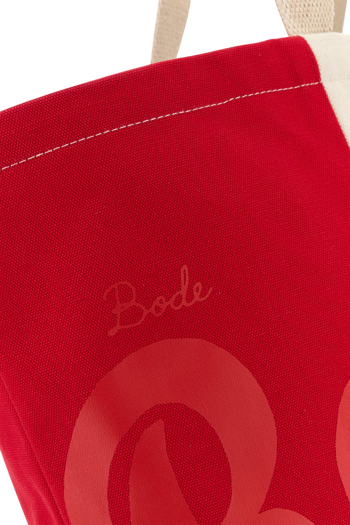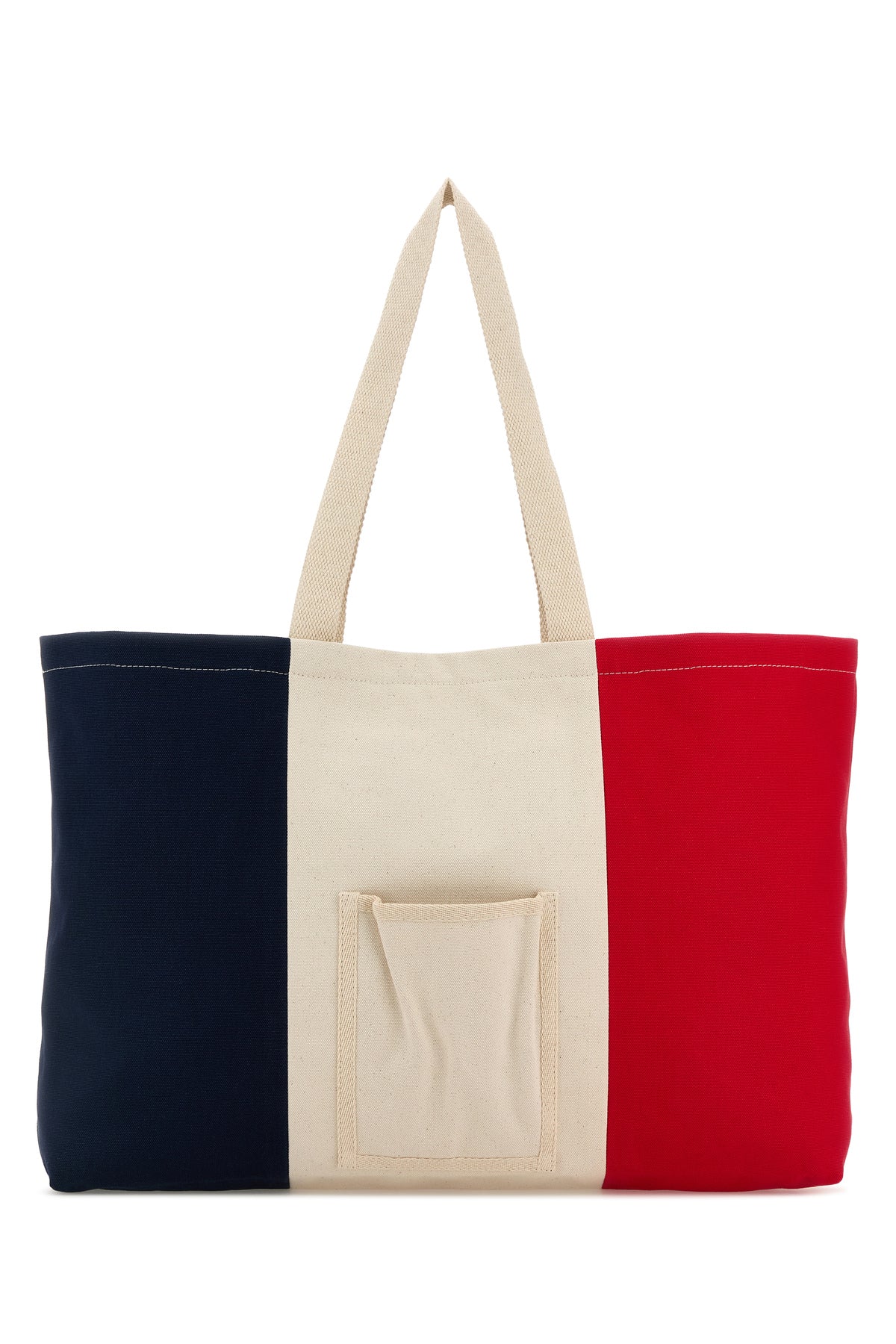 Shopping bag realized in pure cotton canvas characterized by striped embroidery on the entire surface and printed logo at the front.
