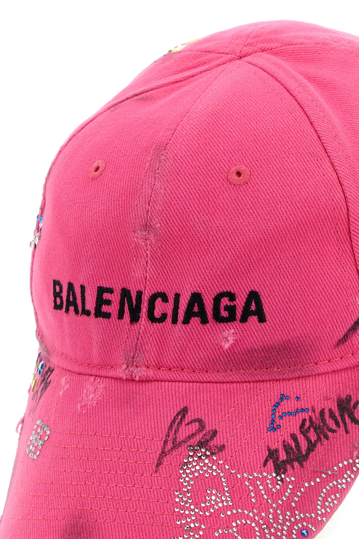Baseball cap realized in distressed effect pure cotton canvas characterized by embroidered logo at the front enriched by rhinestones on the curved visor and on the sides.