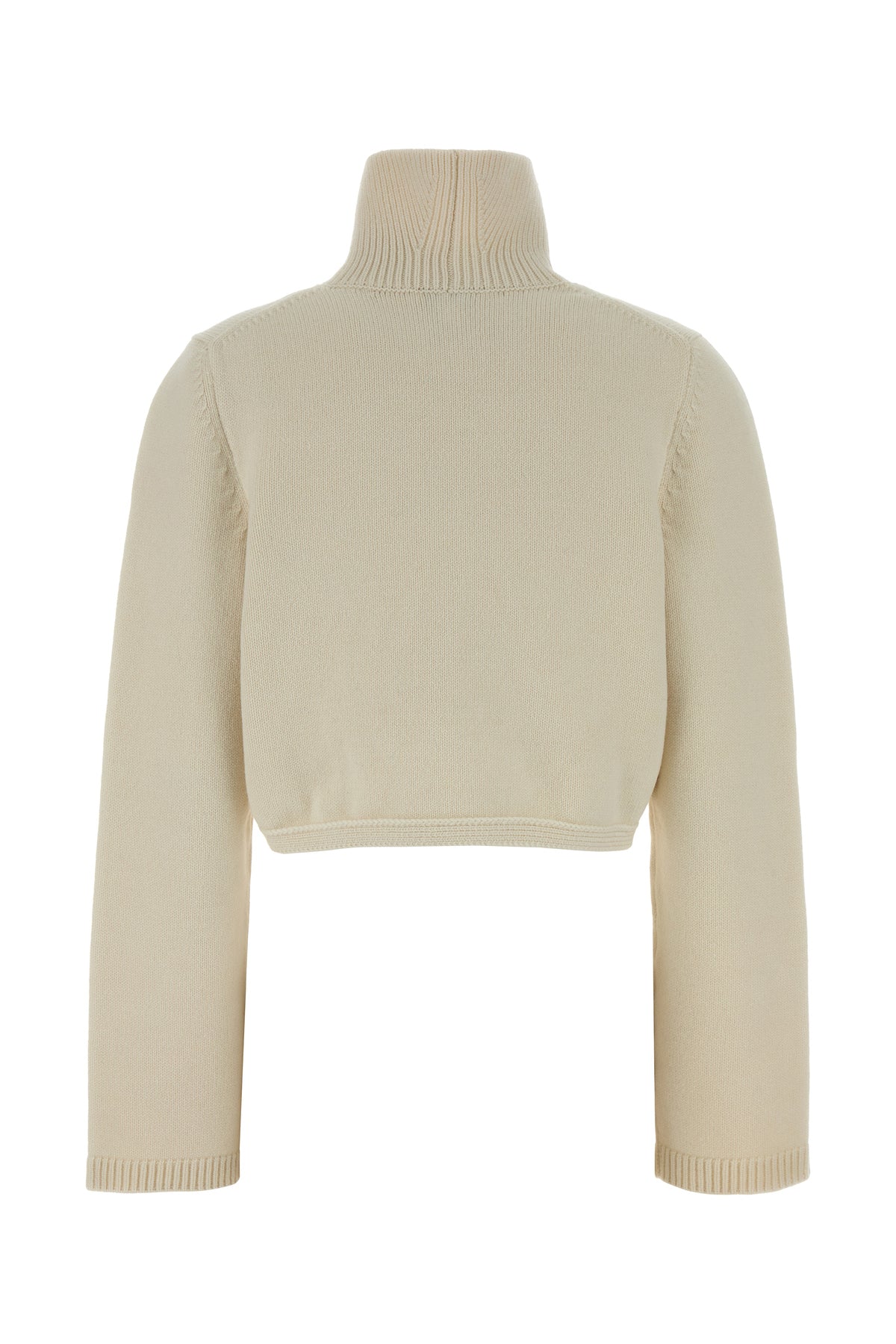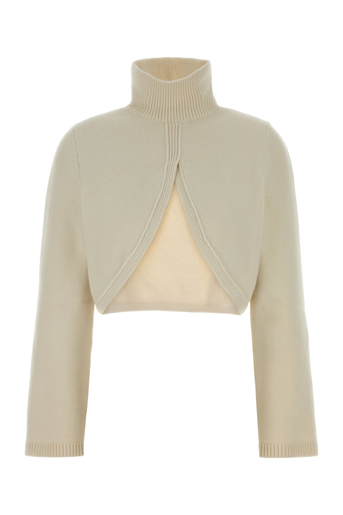Cropped-cut sweater realized in stretch cashmere blend characterized by asymmetric hemline.