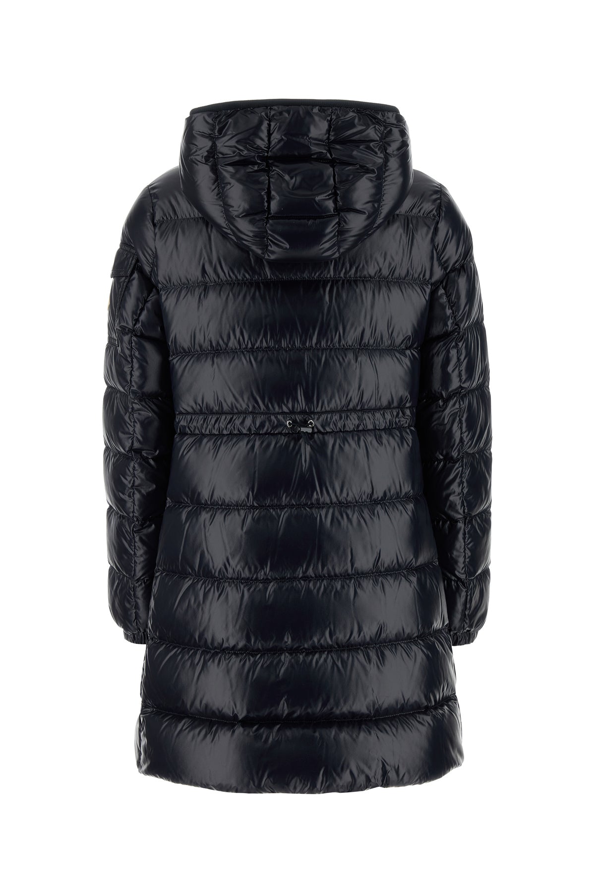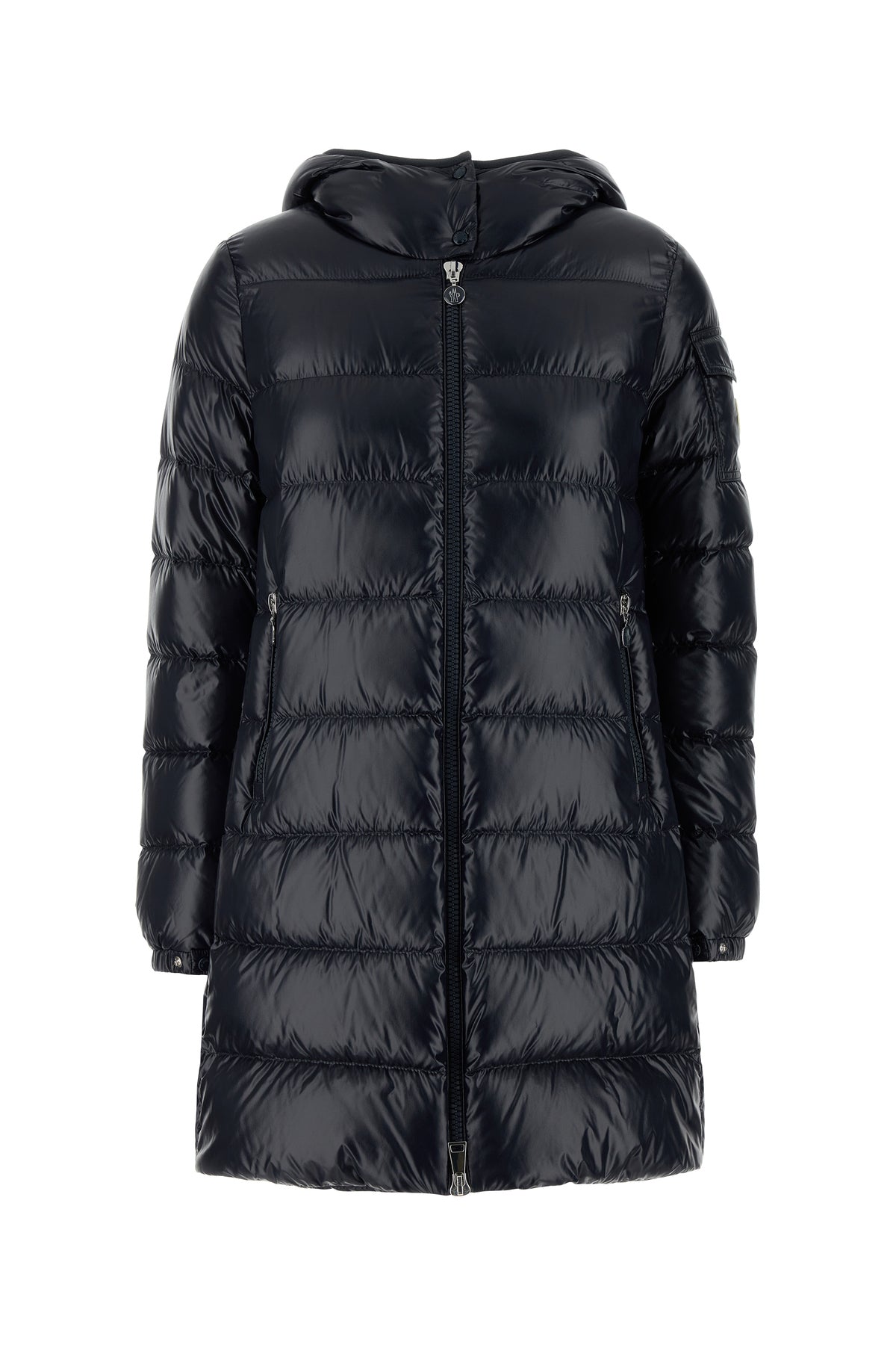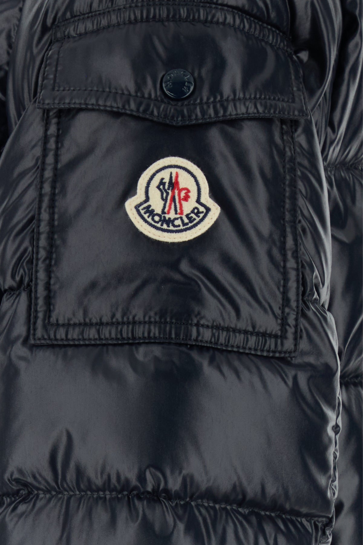 Down jacket realized in quilted polished-finish nylon enriched by contrasting logoed patch on the sleeve.
