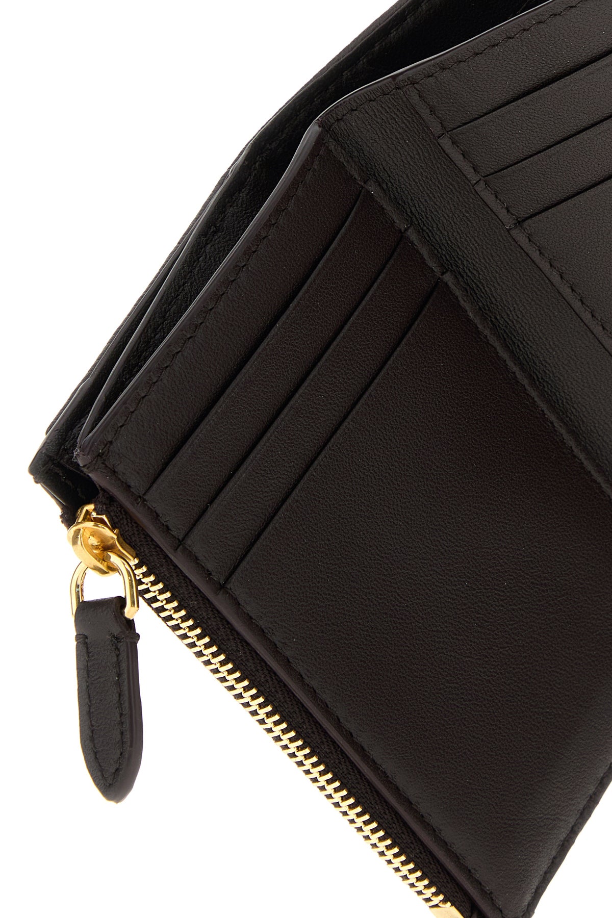 - Interior with a bill compartments, a zip pocket, a slit pocket and six credit card slots