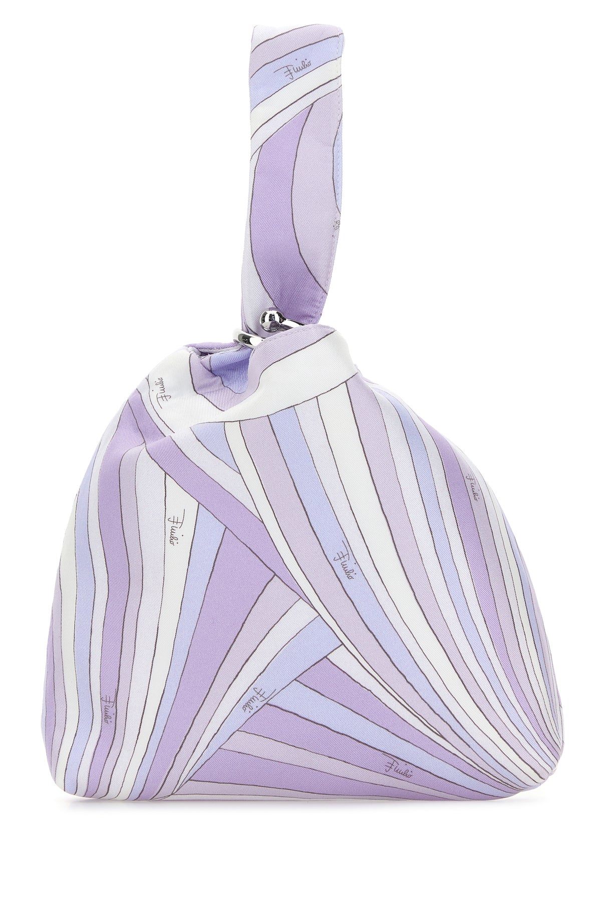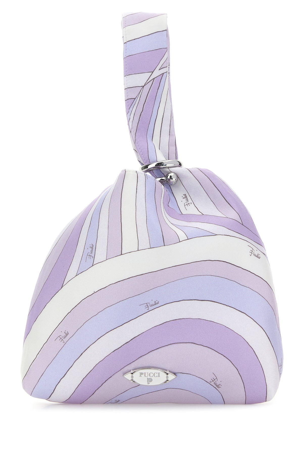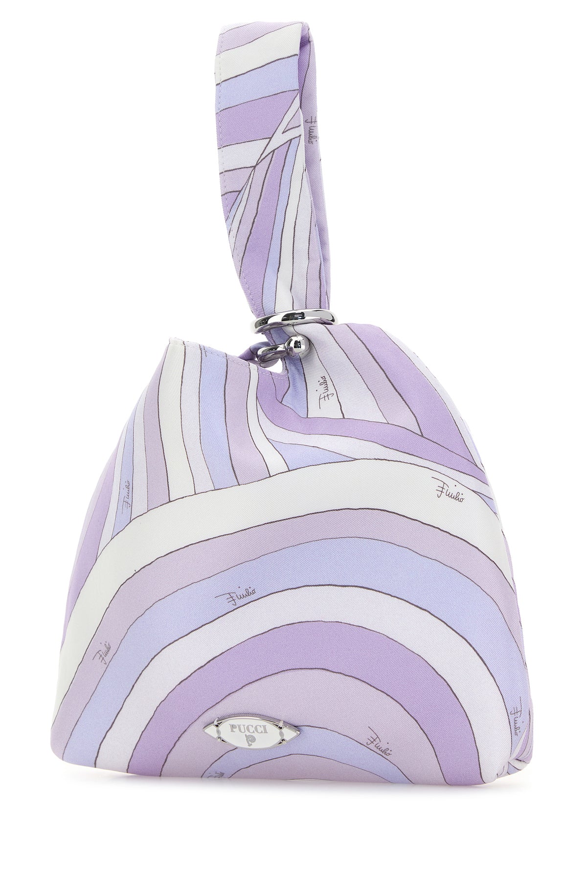 Handbag realized in fabric characterized by peculiar print on the entire surface enriched by logoed metal detail at the front.
