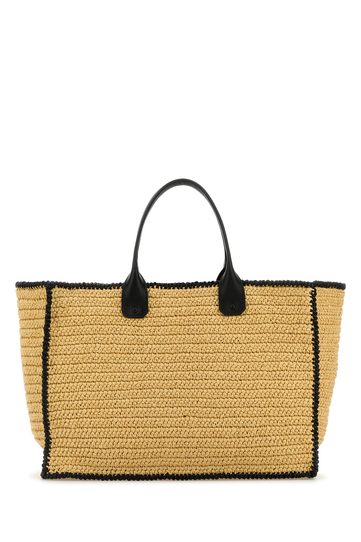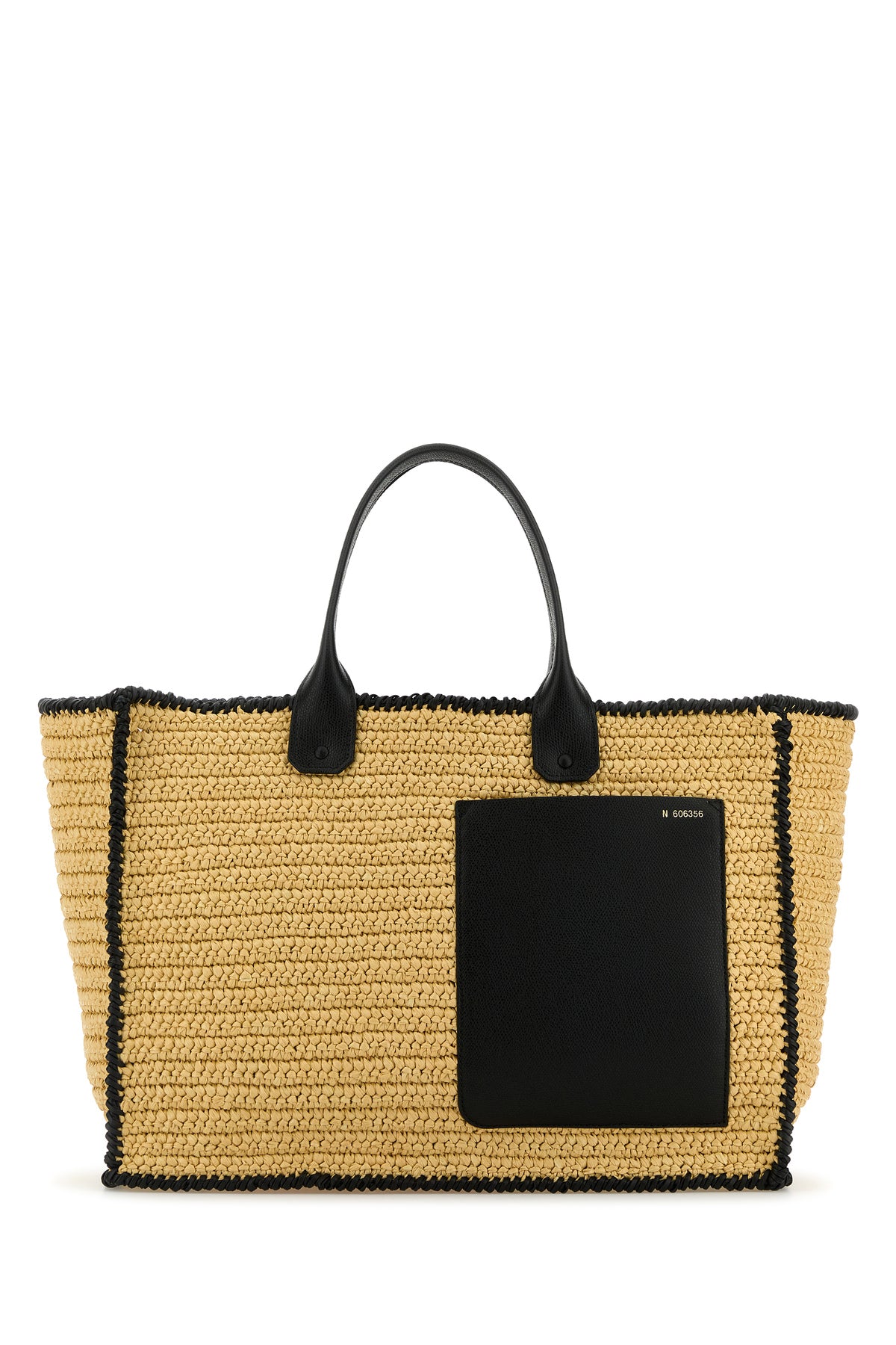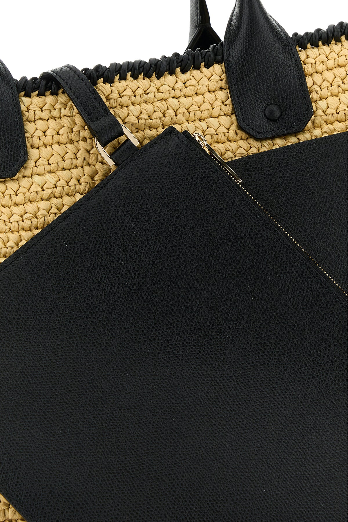 Shopping bag realized in raffia enrich by leather patch pocket at the front.