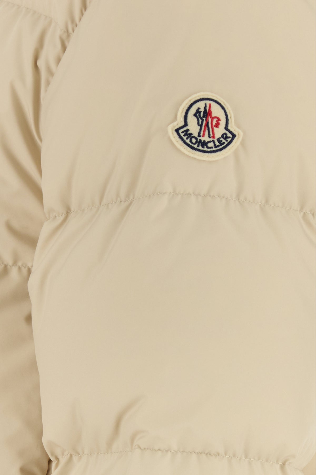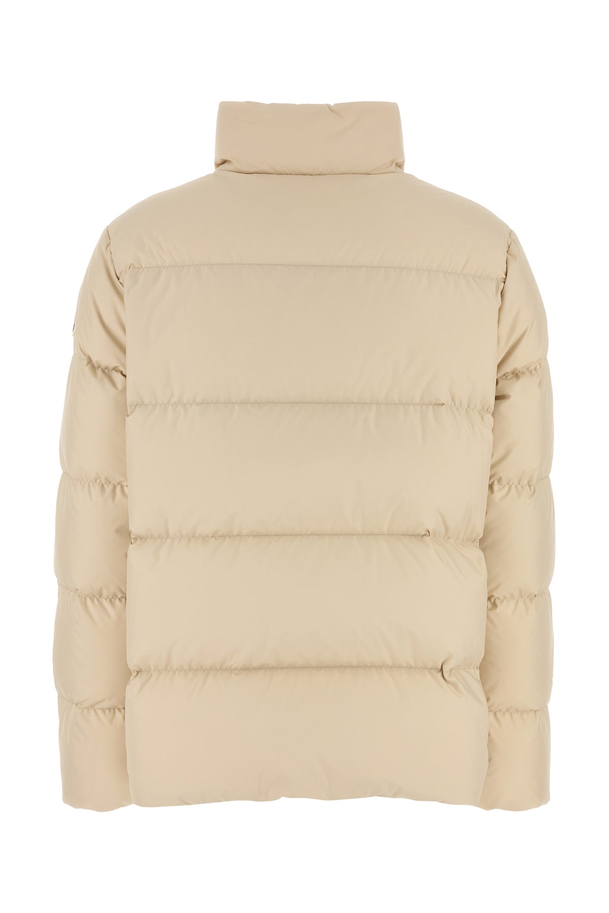 Down jacket realized in quilted polyester enriched by contrasting logoed patch on the sleeve.