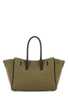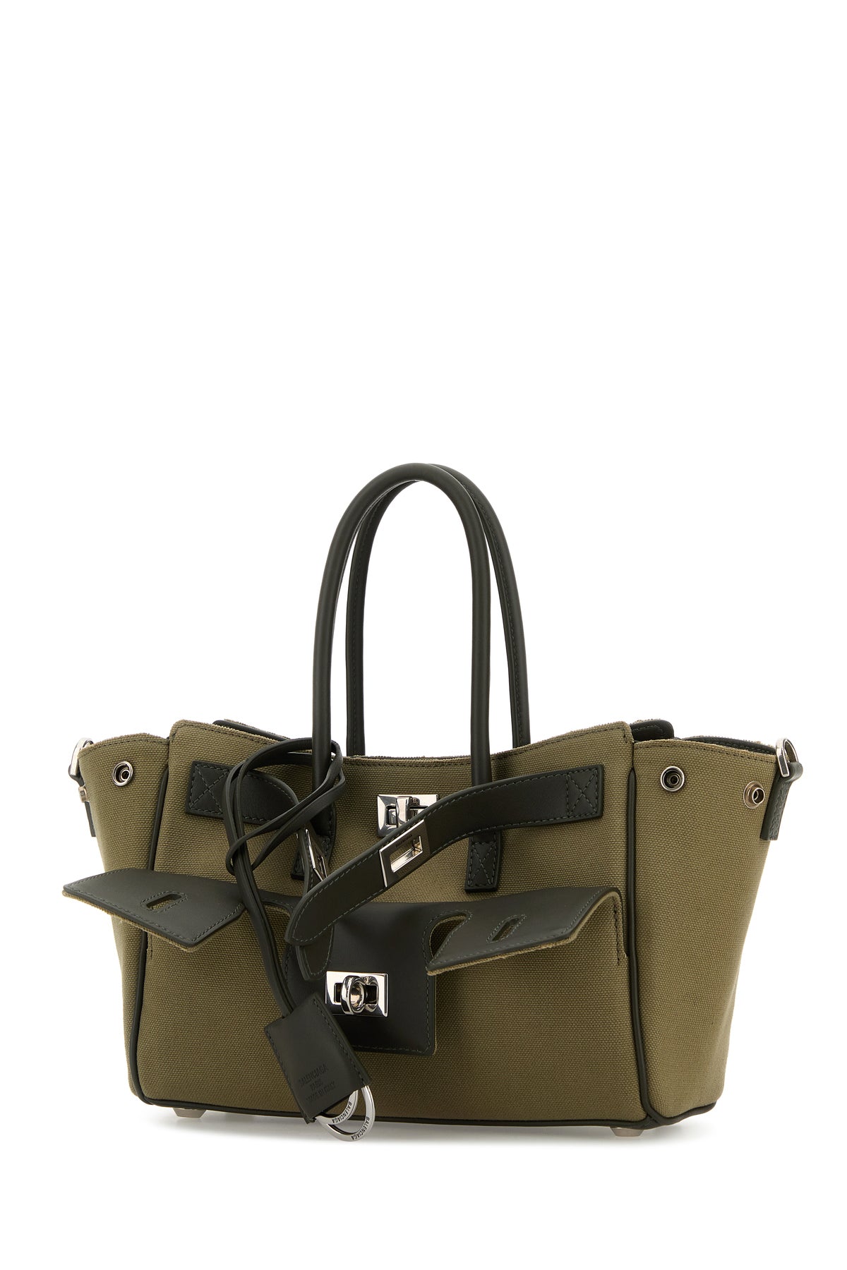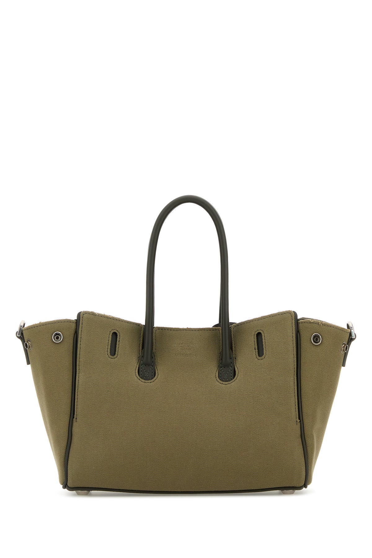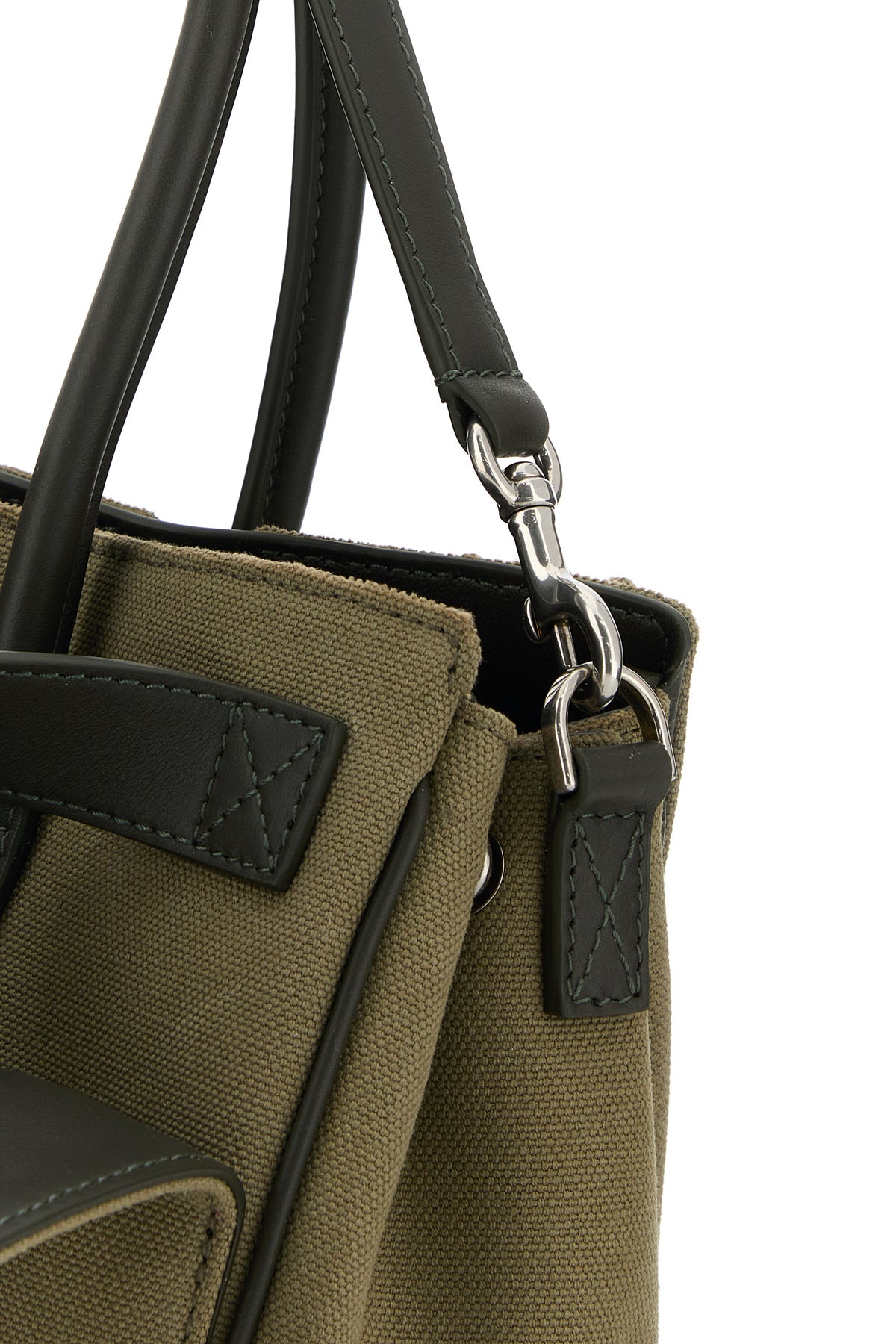 Shopping bag realized in canvas characterized by embossed logo at the back enriched by detachable keyring accessory and peculiar decorative pockets at the front.