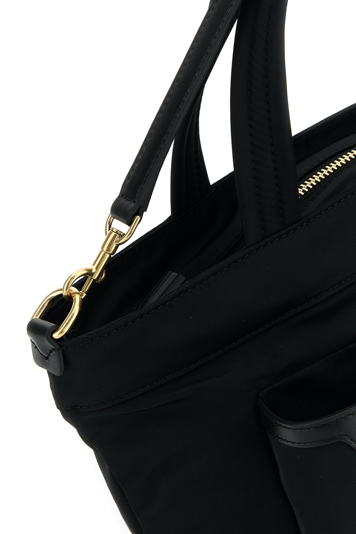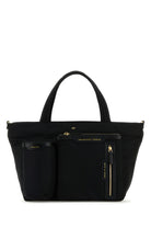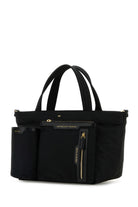 Handbag realized in canvas enriched by logoed metal detail at tHe front.
