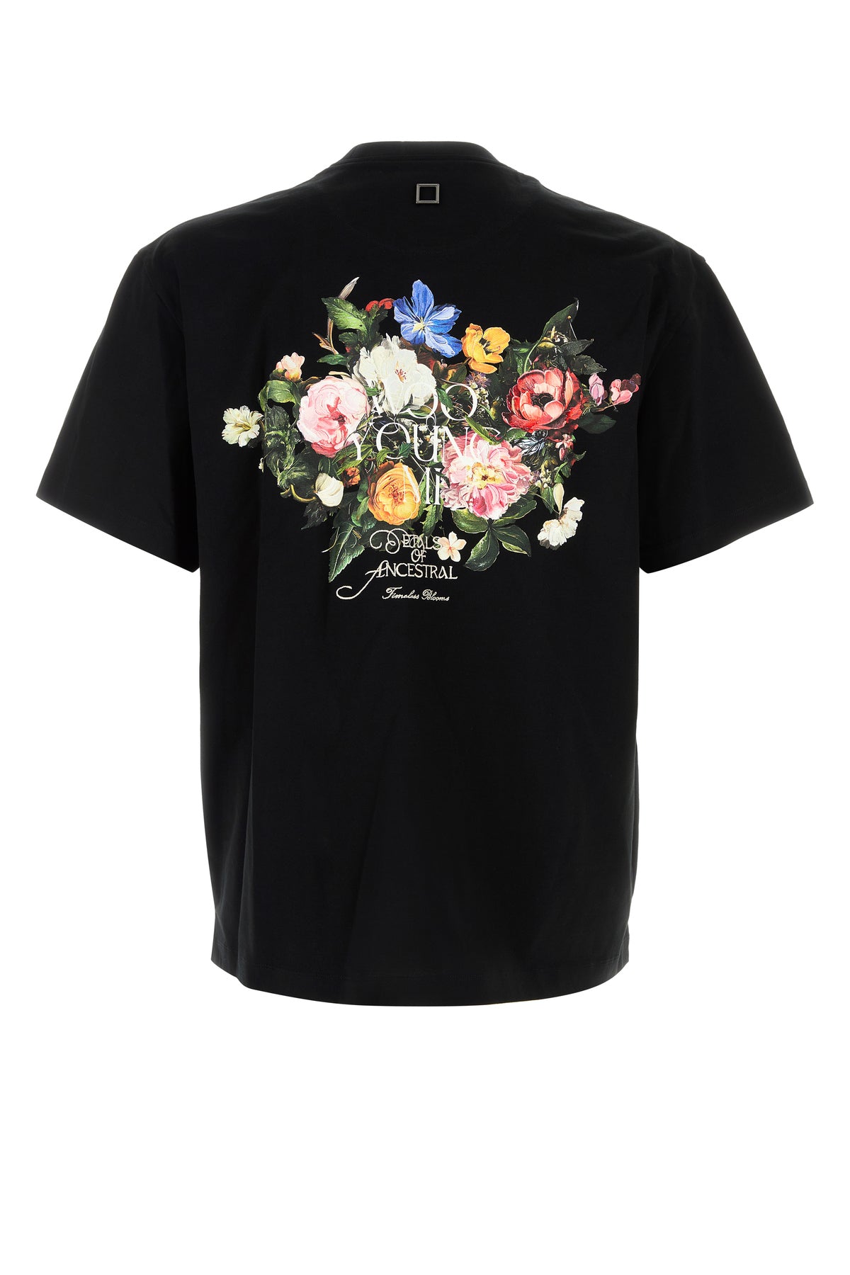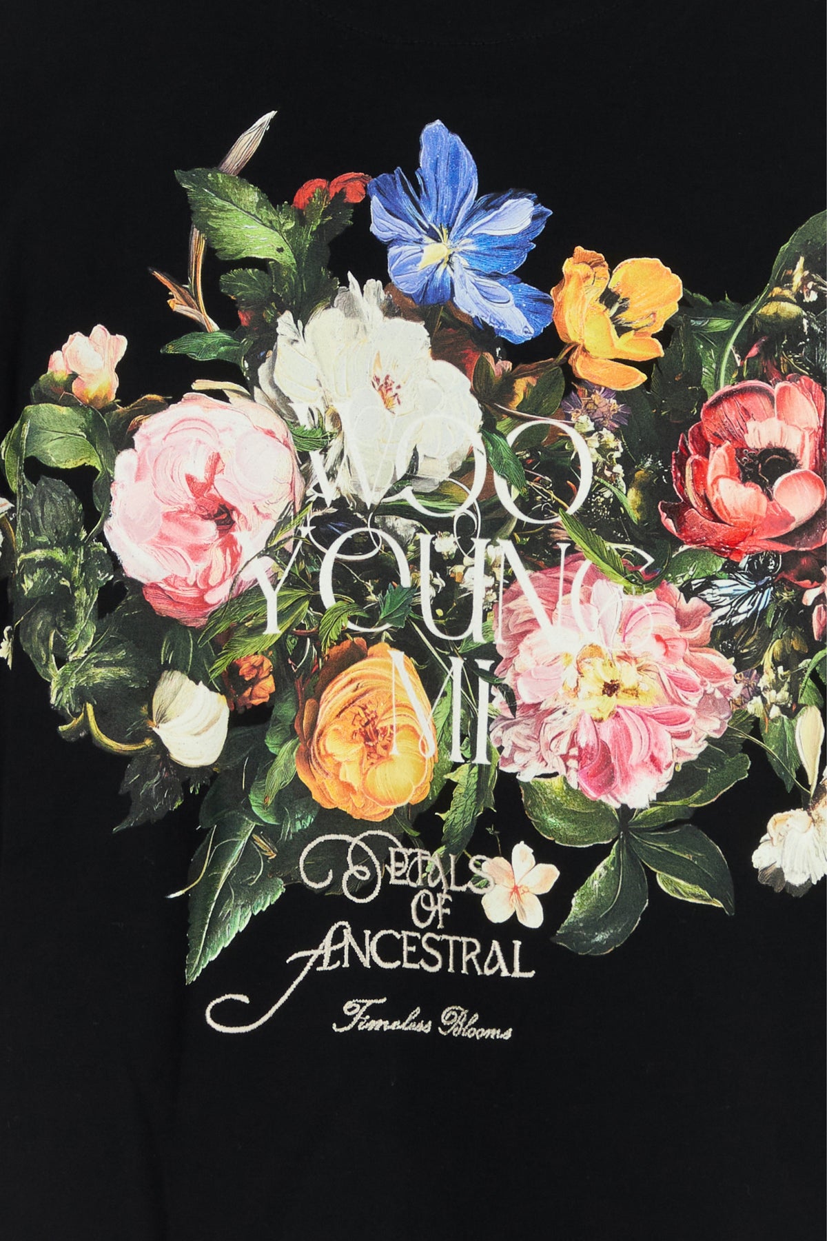 T-shirt realized in pure cotton characterized by peculiar floral print at the back enriched by tonal logoed patch on the chest and metal logoed detail at the back.