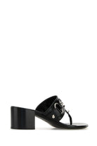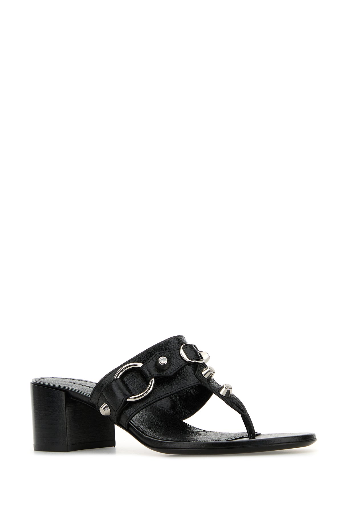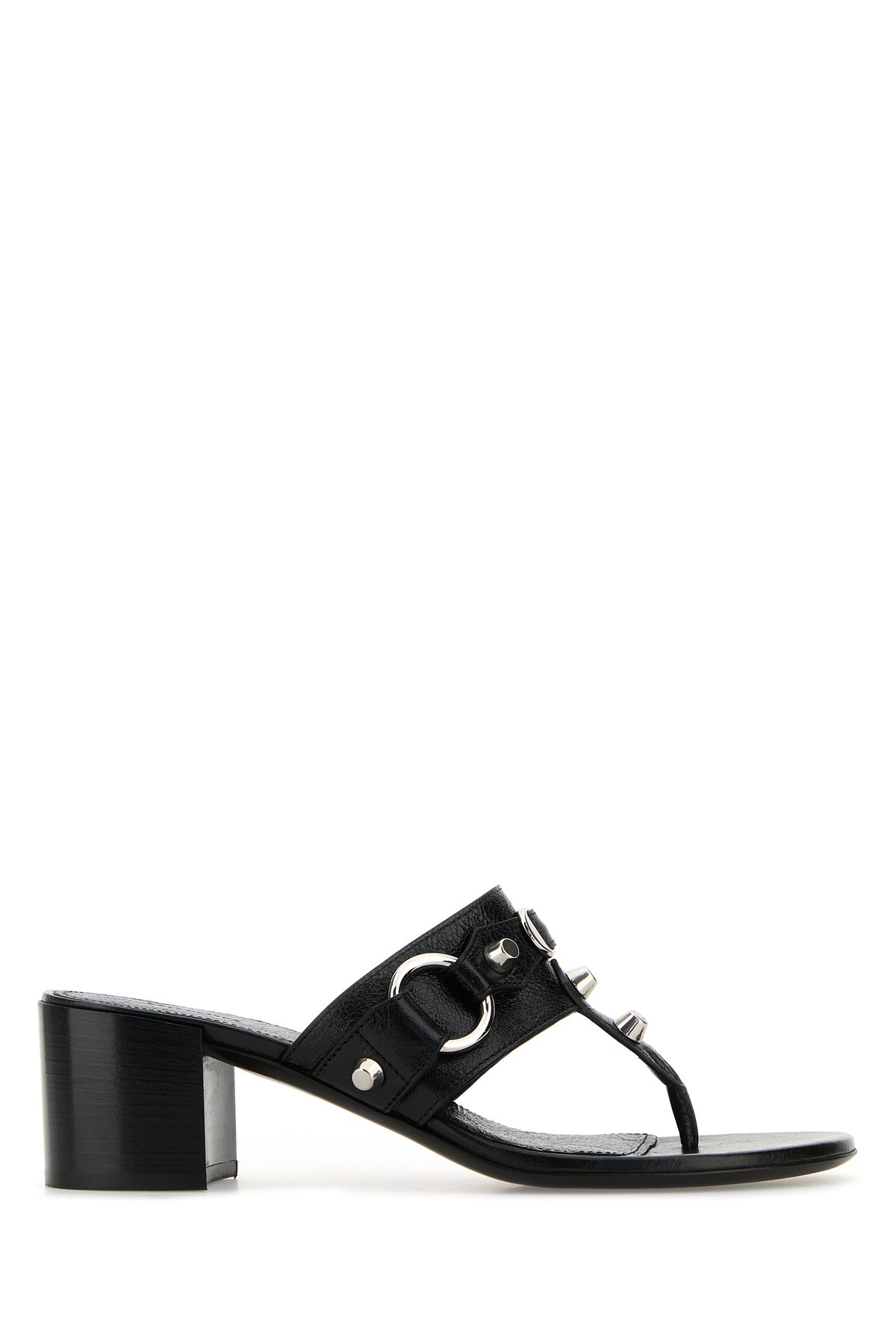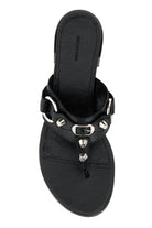 Thong mules realized in Arena lamb leather enriched by metal studs and buckles on the instep.