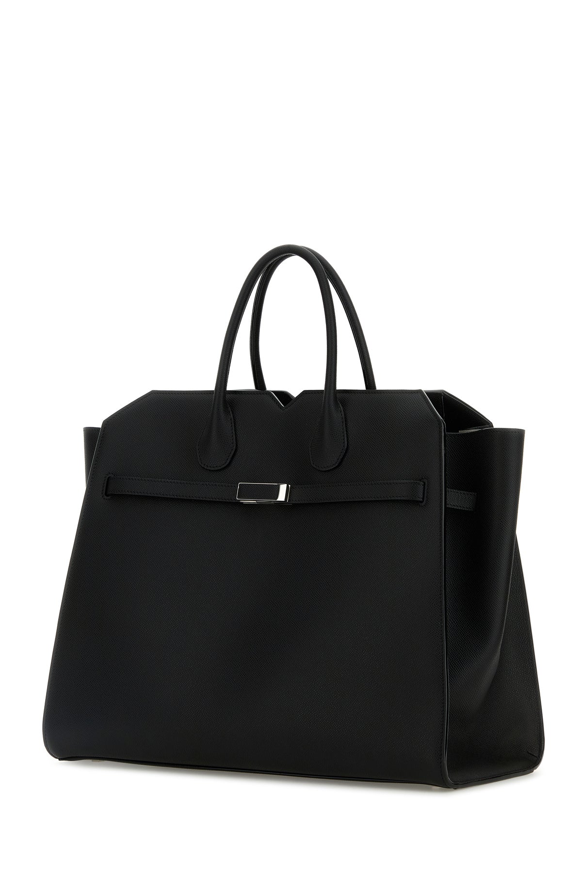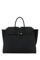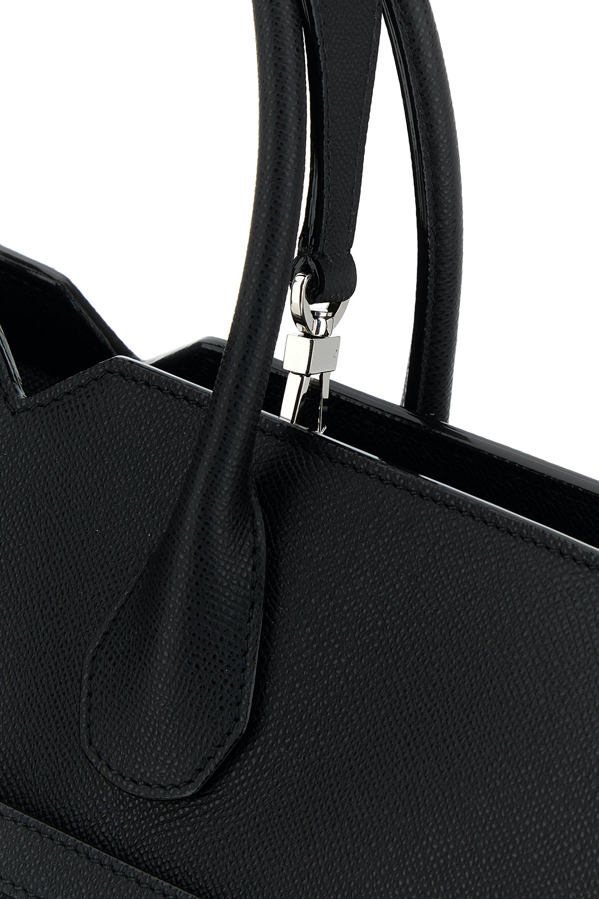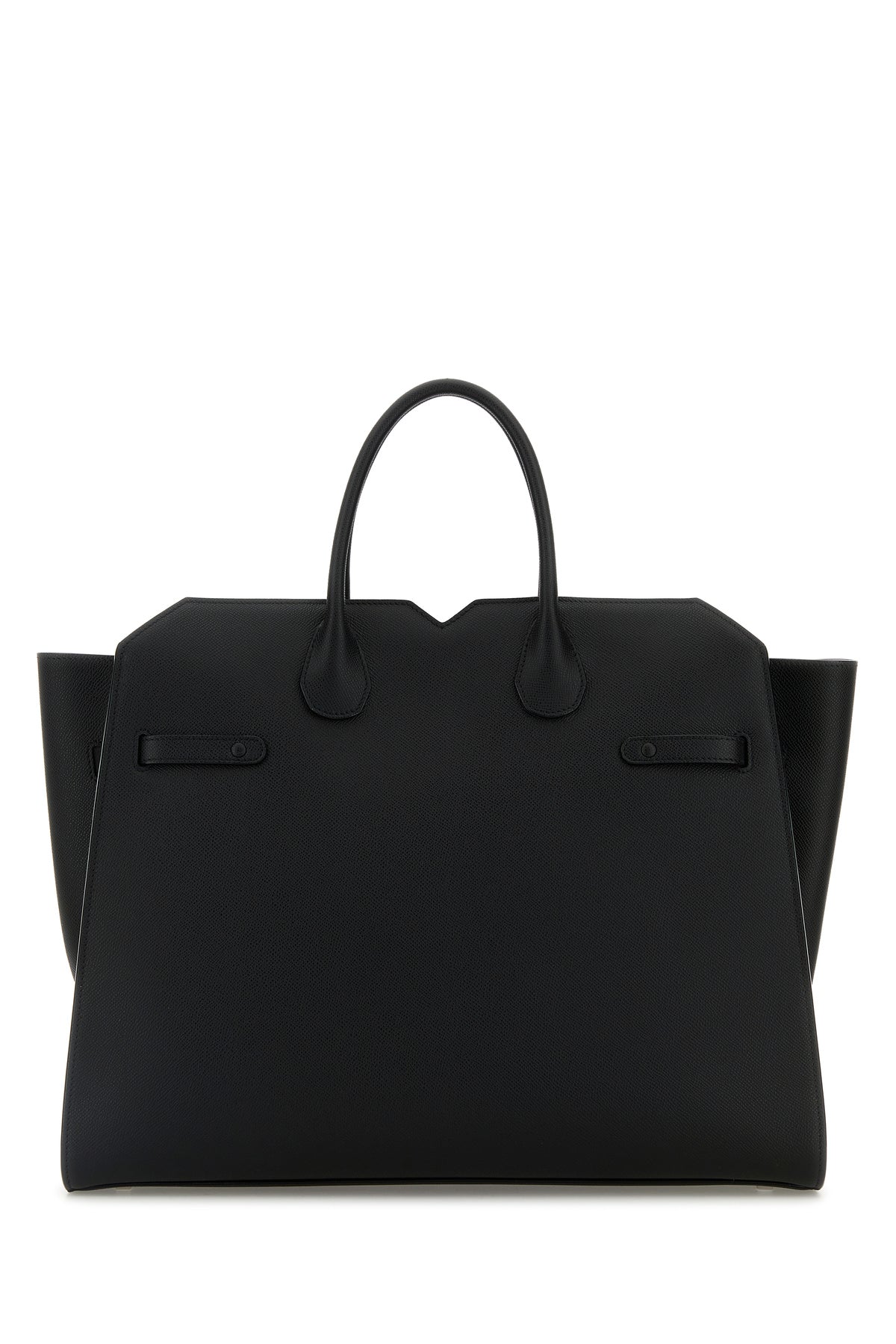 Shopping bag realized in grained calf leather characterized by lateral compression straps.