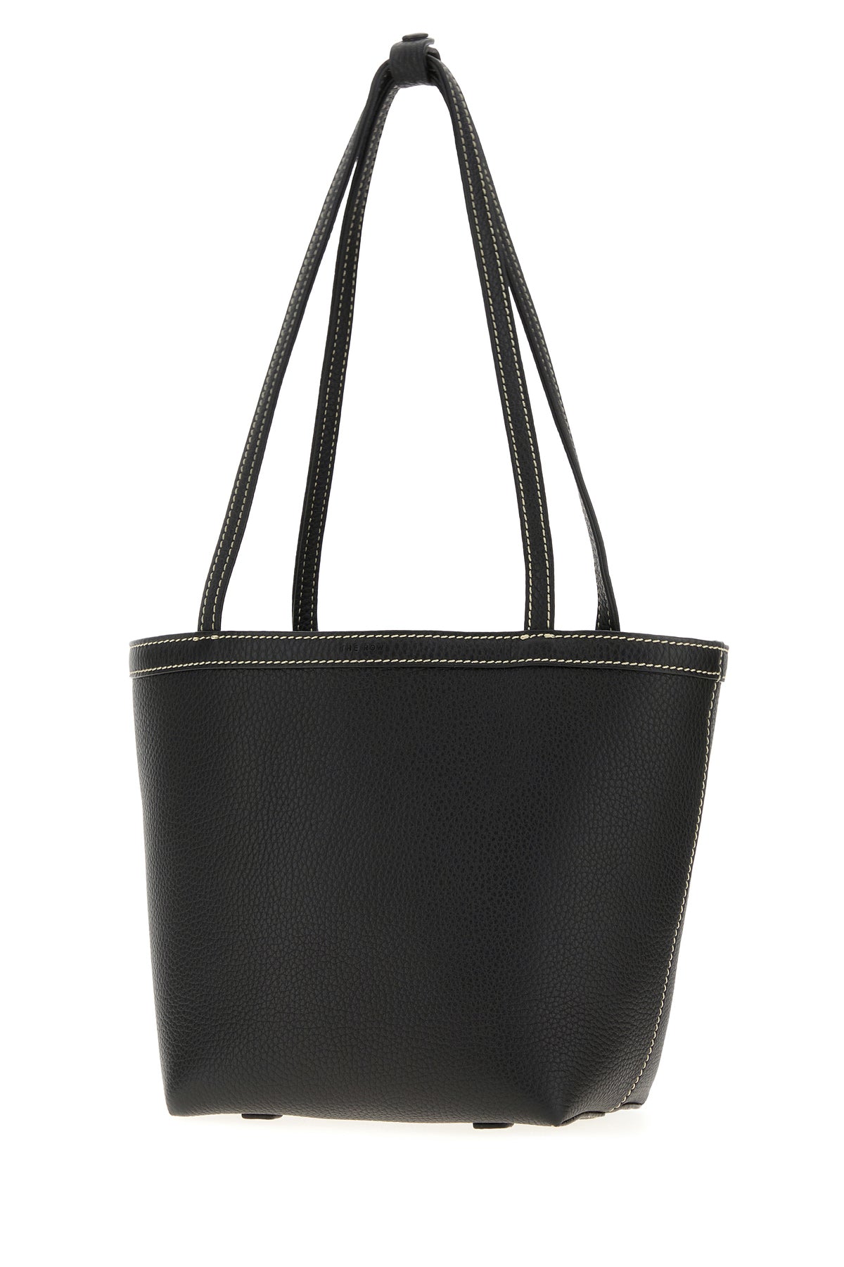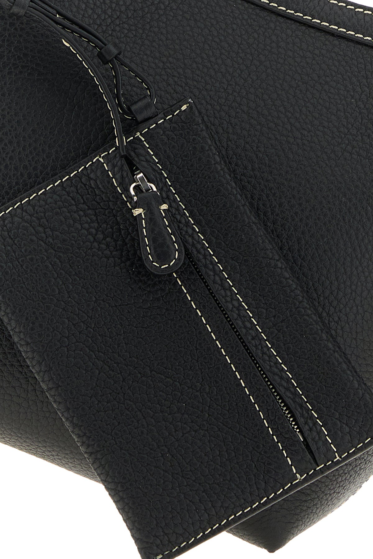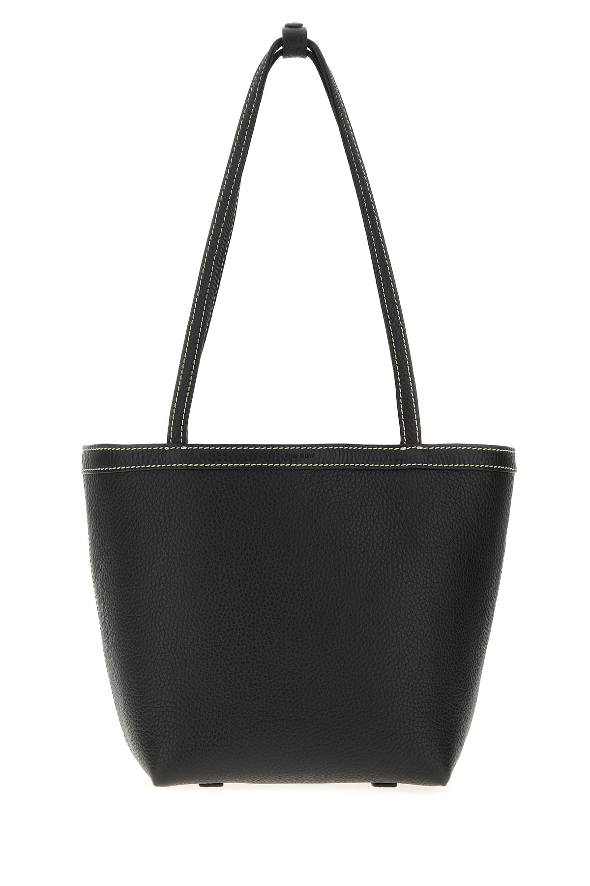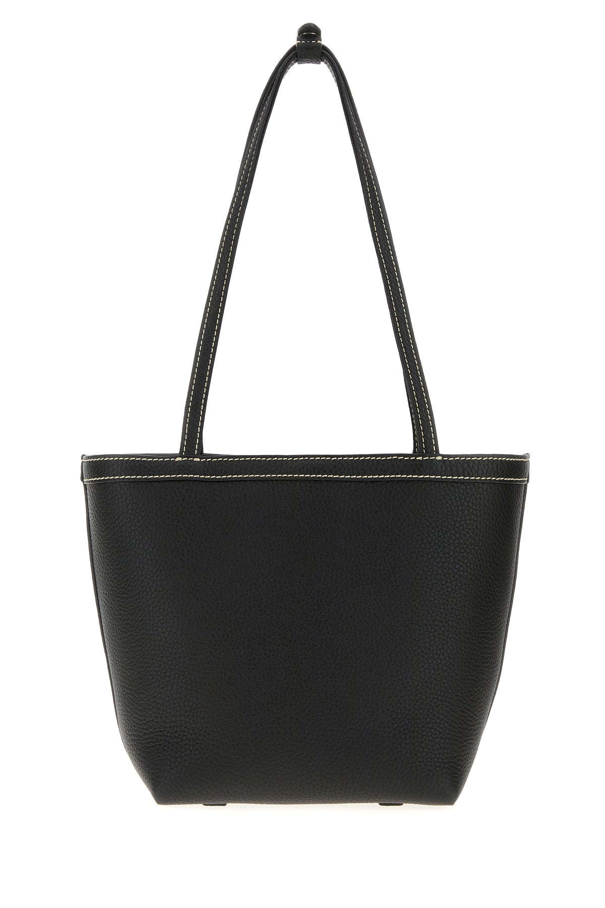 Bucket bag realized in pebble calf leather characterized by contrasting stitchings.