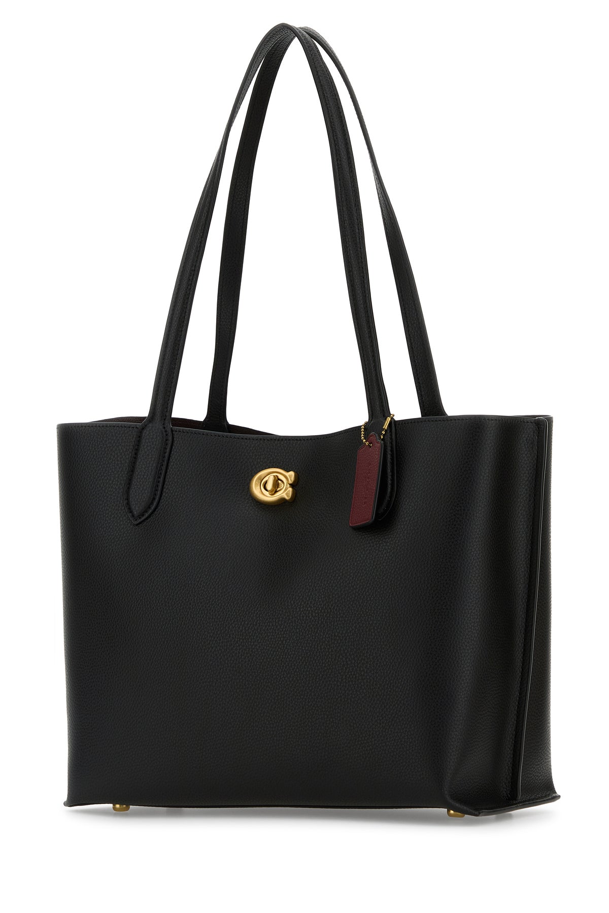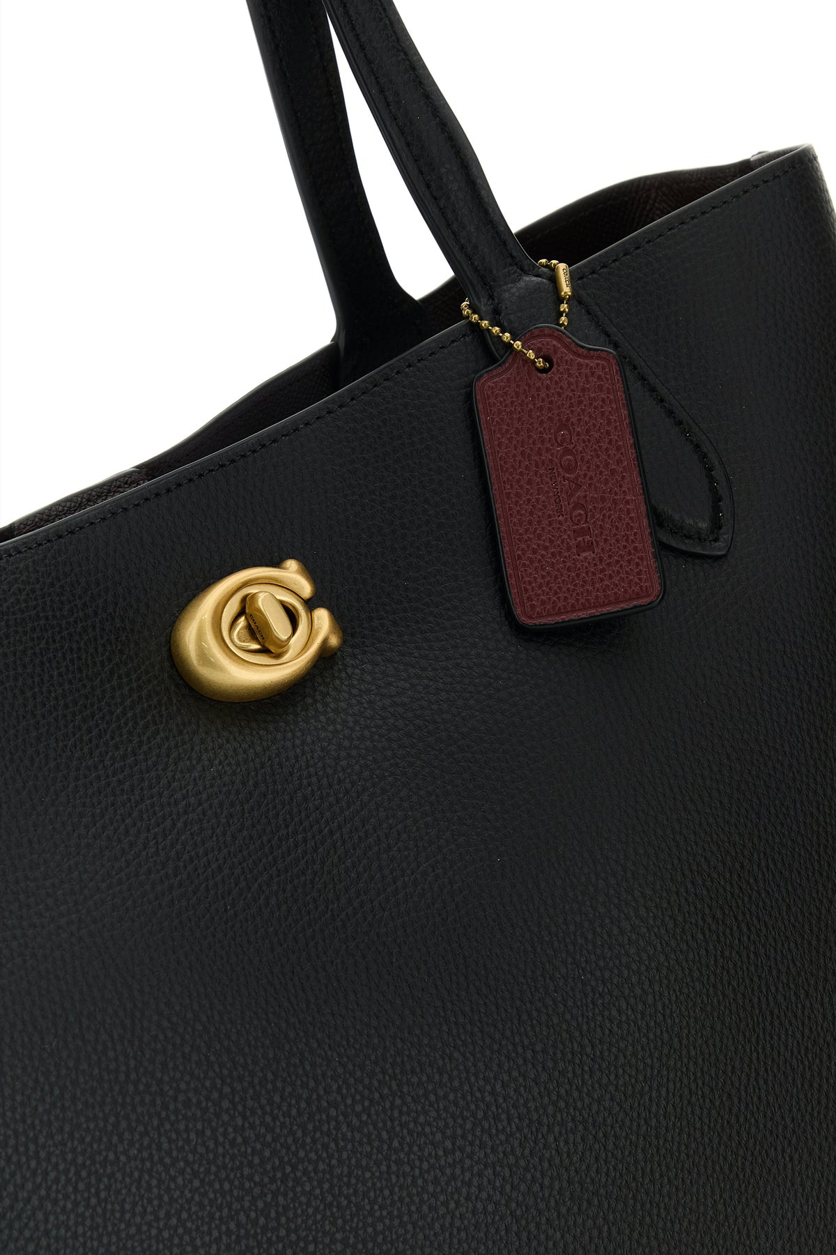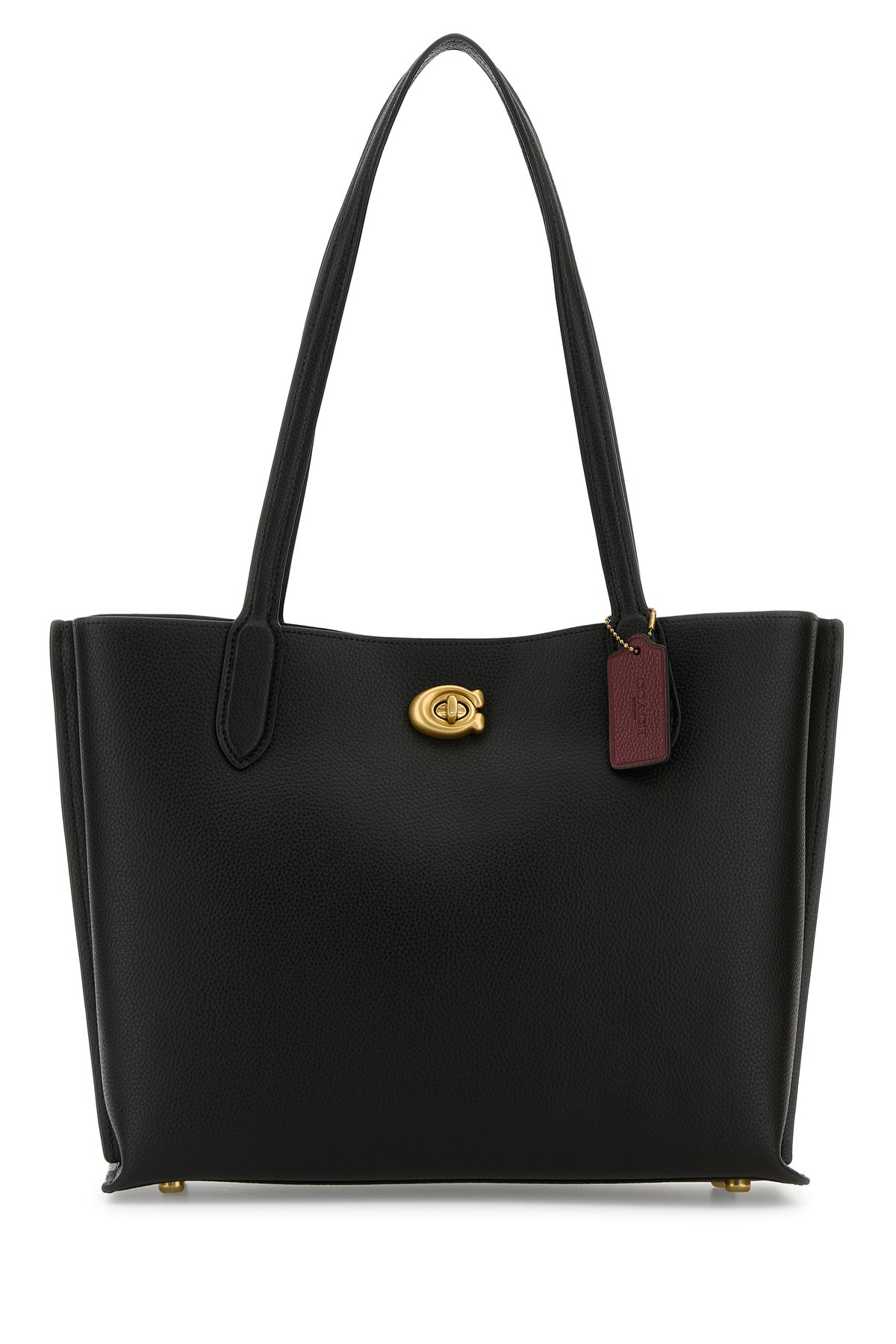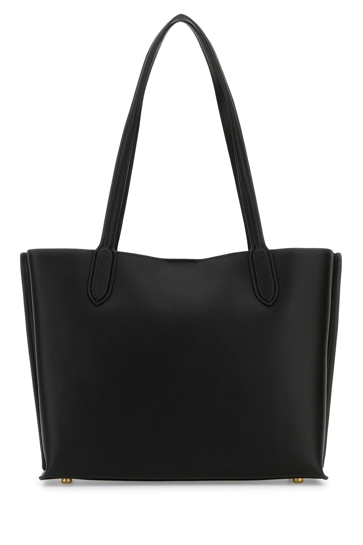 Shopping bag realized in pebble leather enriched by metal logoed detail at the front and detachable logoed accessory at the top.