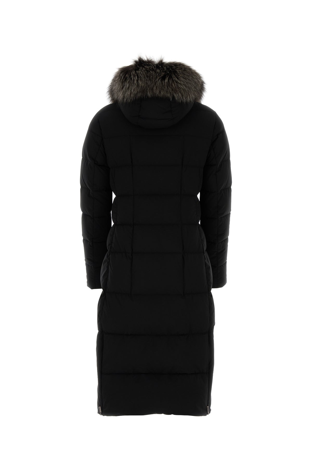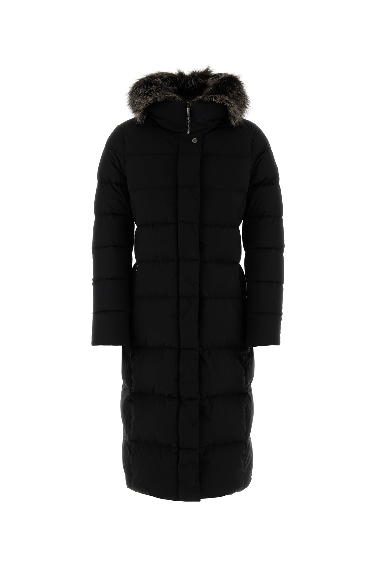 Down jacket realized in quilted nylon blend with eco fur insert on the hood.