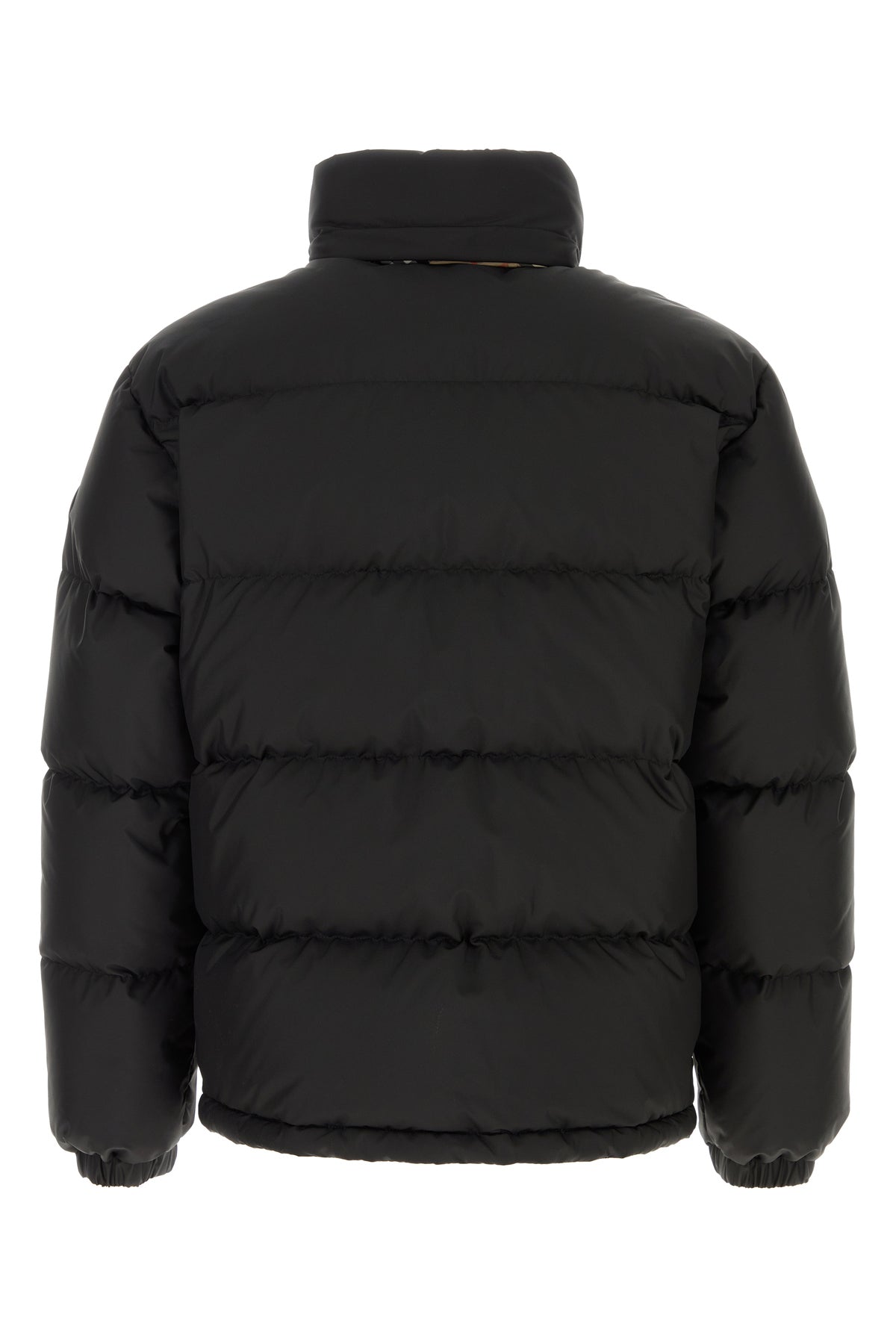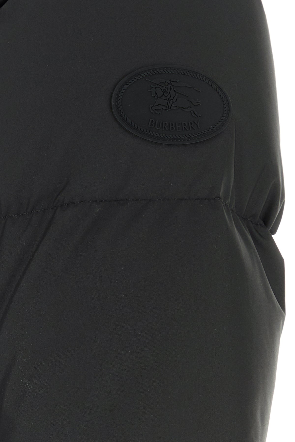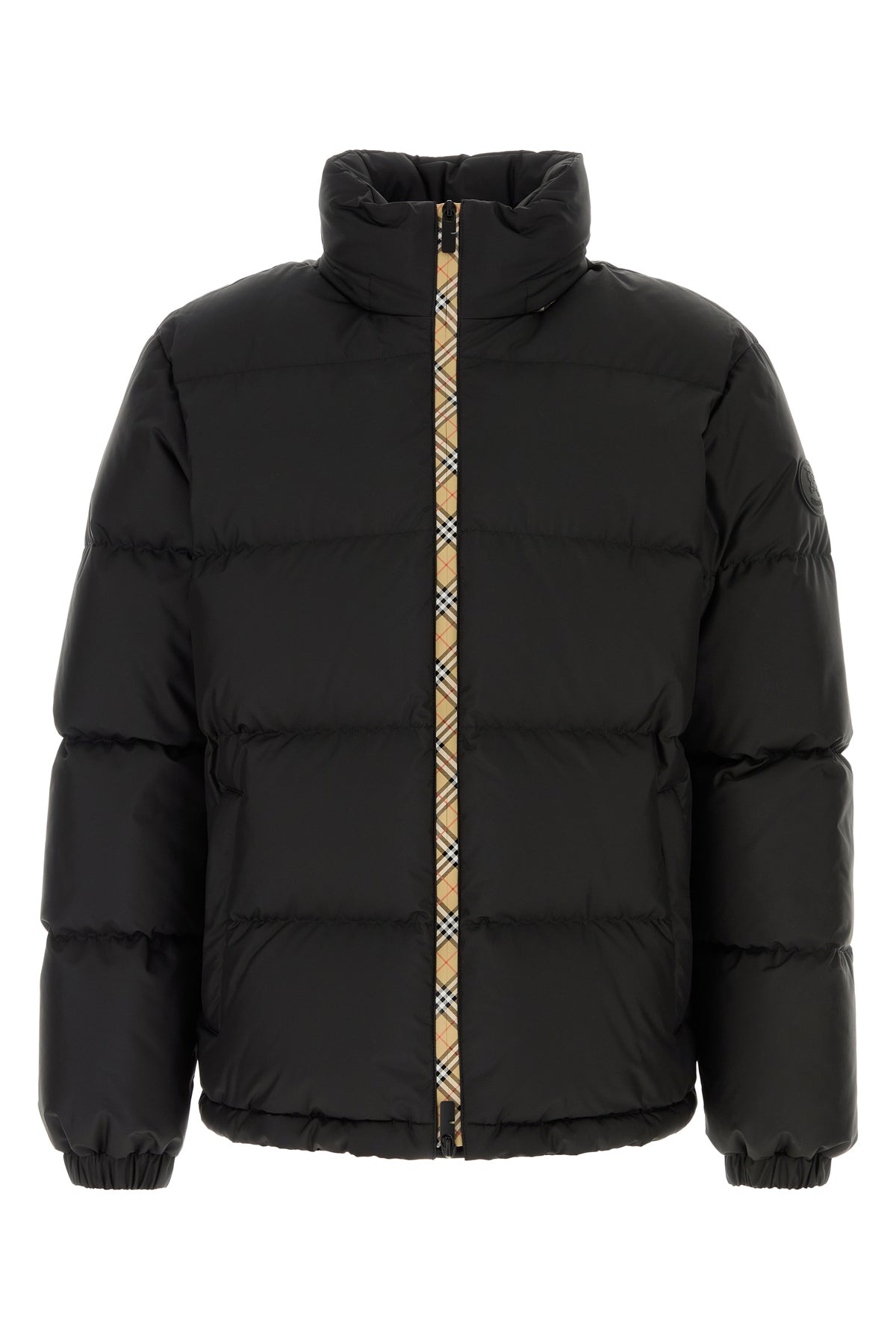 Down jacket realized in quilted nylon enriched by rubberized logoed label on the sleeve.