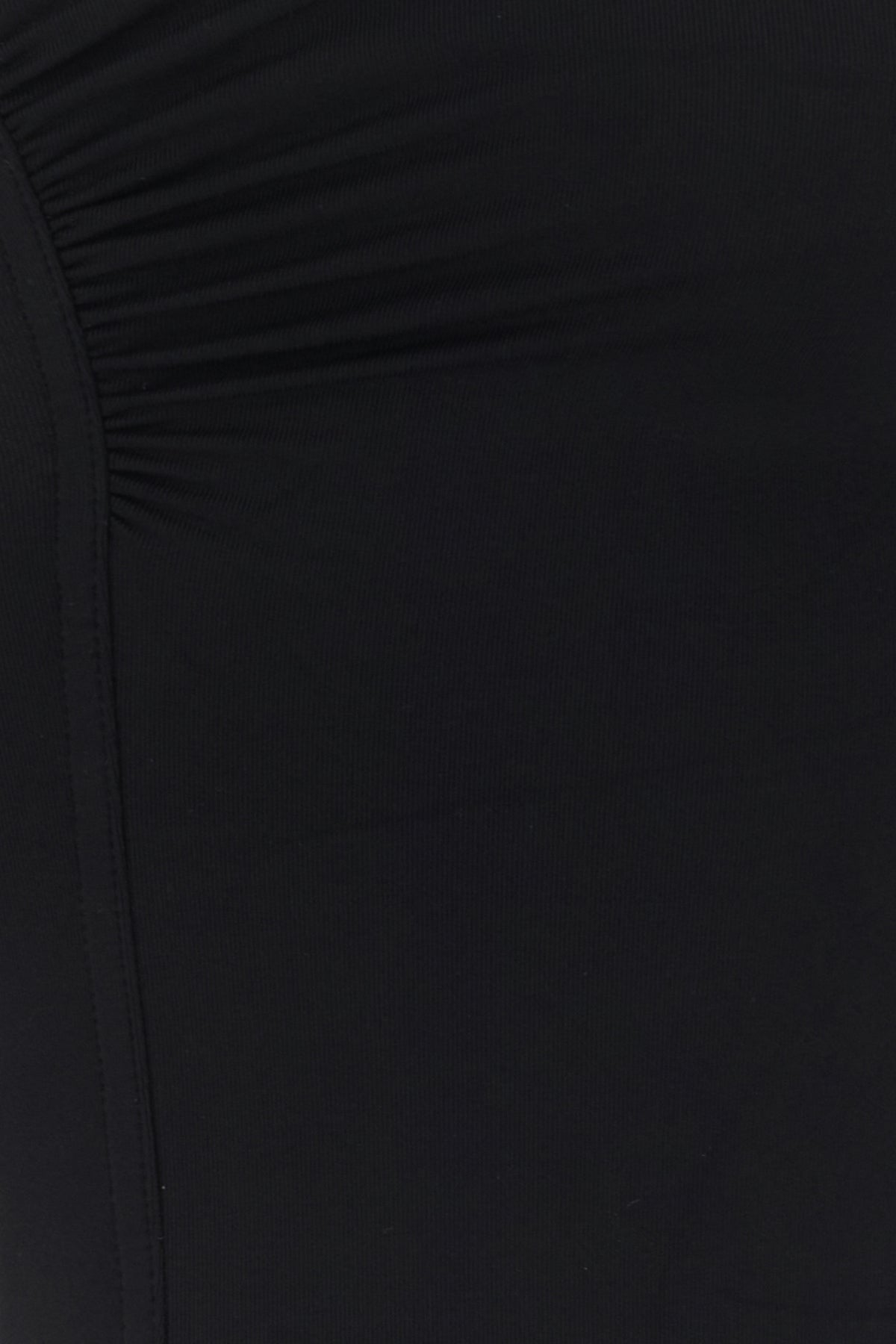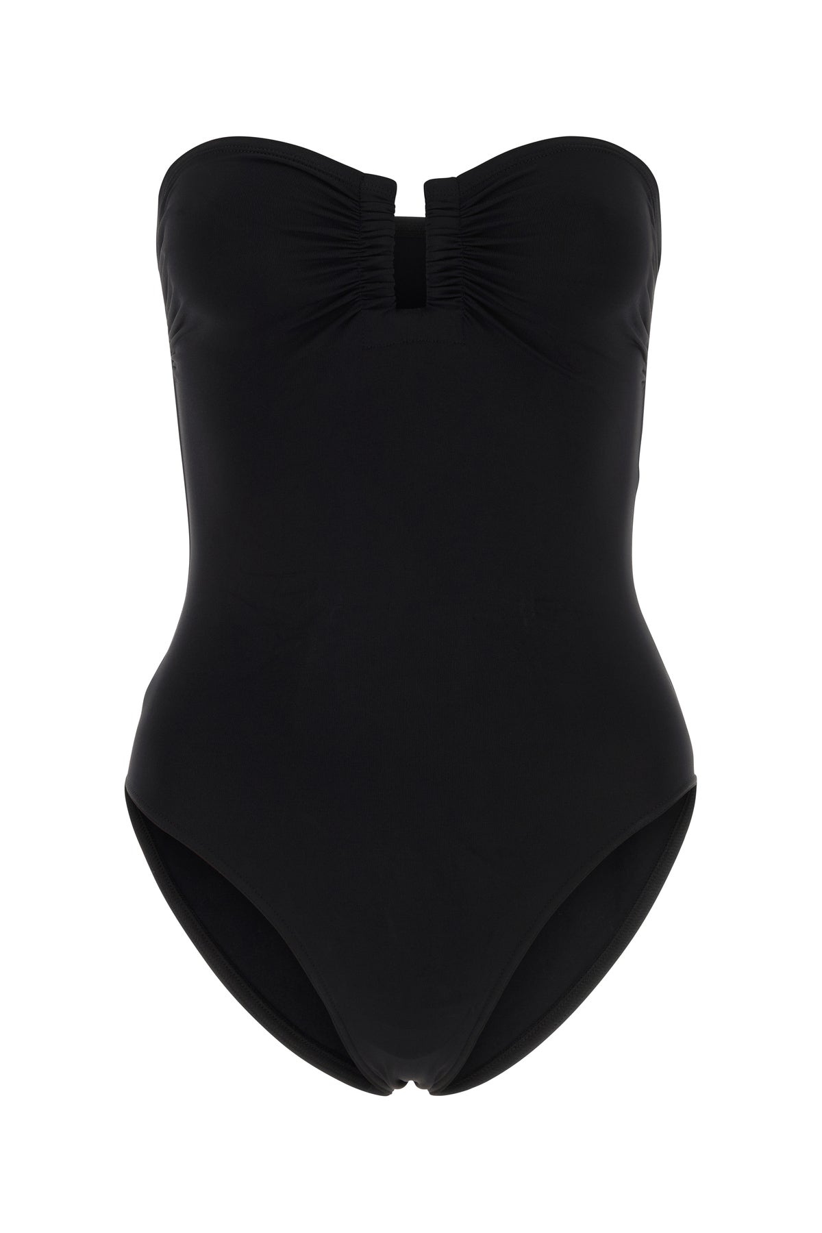 Swimsuit realized in stretch nylon characterized by peculiar gathered neckline with metal detail.