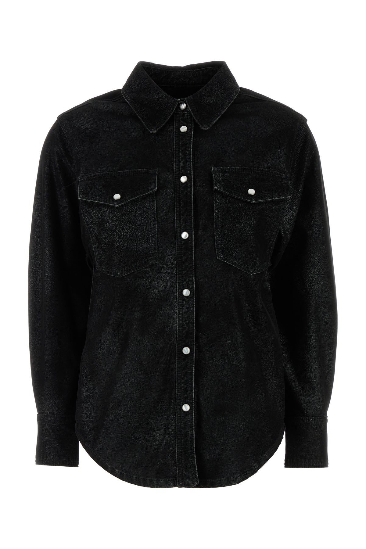 Shirt realized in stonewashed effect synthetic leather charactered by short-pointed collar.