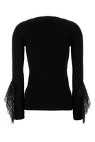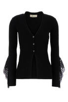 Cardigan realized in ribbed viscose blend enriched by tonal lace flounces on the cuffs.