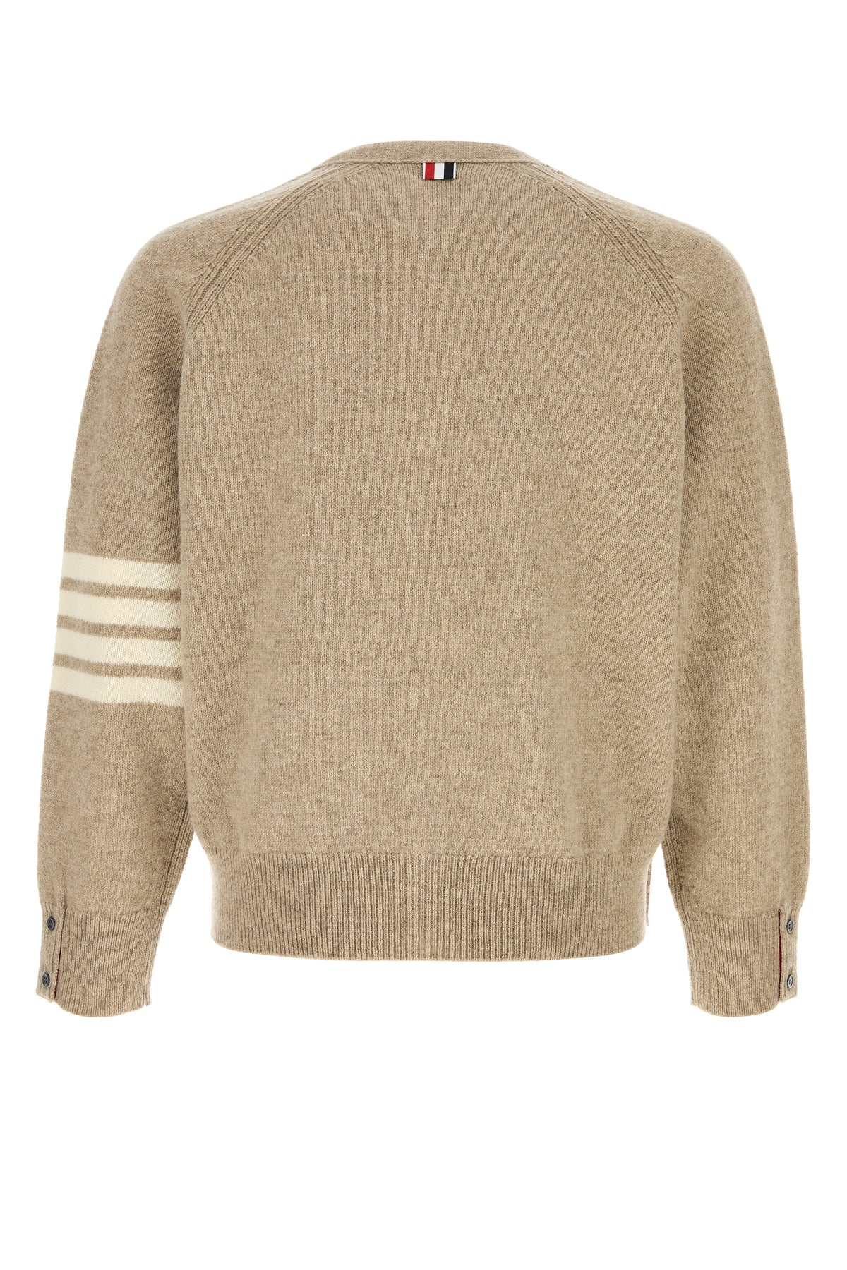 Cardigan realized in pure wool characterized by contrasting bands on the sleeve enriched by iconic tricolor label at the back.