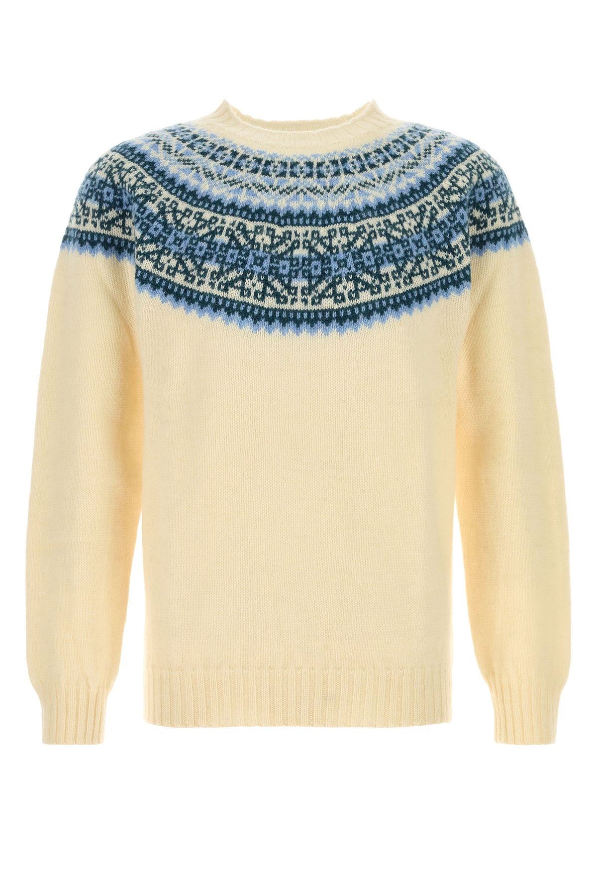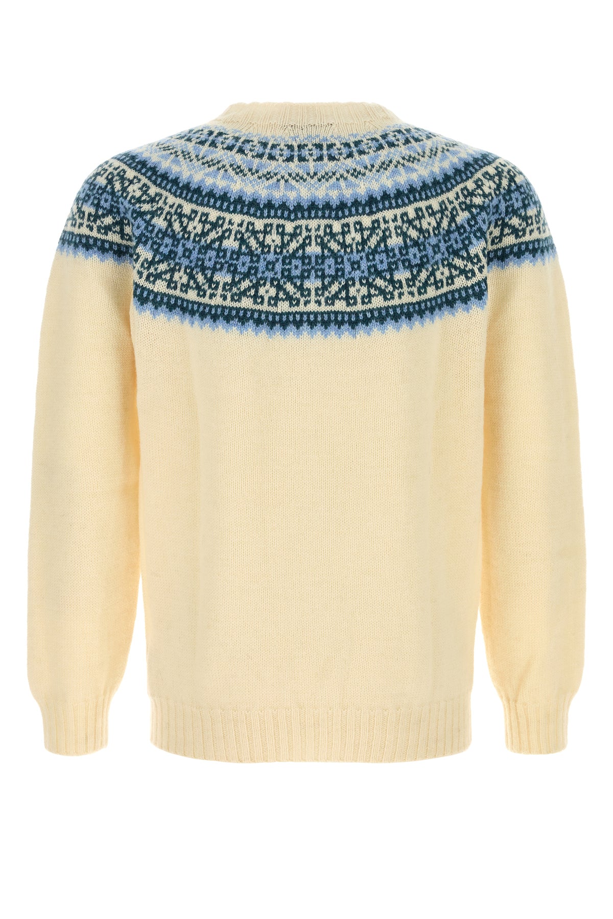Sweater realized in pure wool characterized by peculiar embroidery at the top.