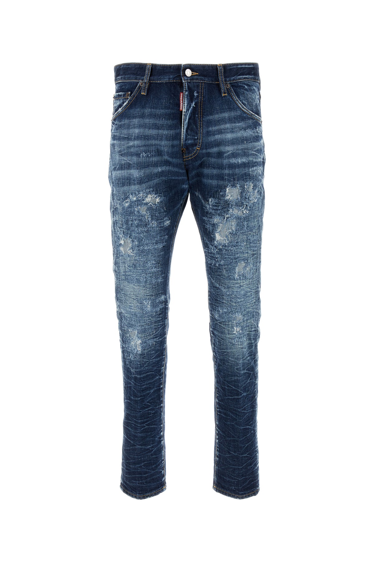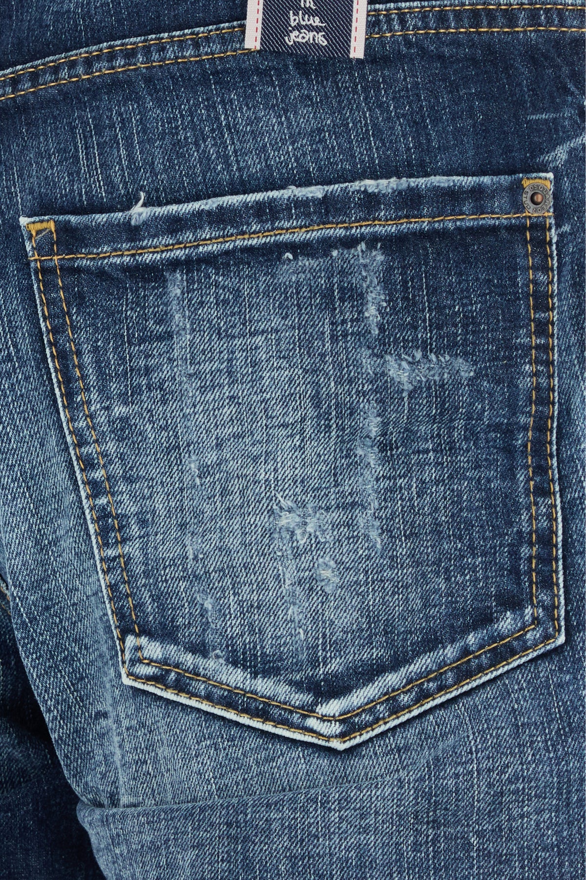 Jeans realized in stonewashed and distressed pure cotton denim with repaired rips enriched by logoed label at the back.