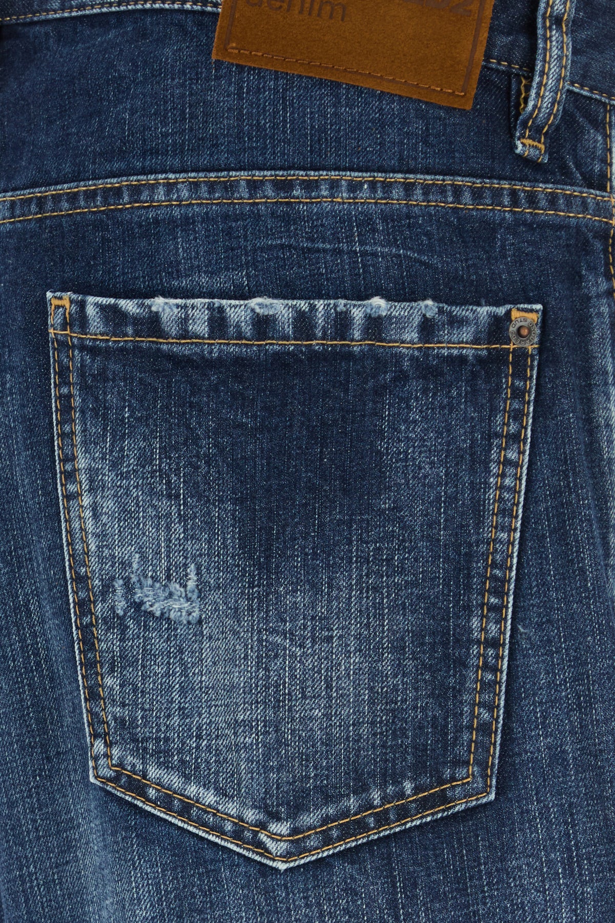 Jeans realized in stonewashed and distressed pure cotton denim enriched by logoed label at the back.