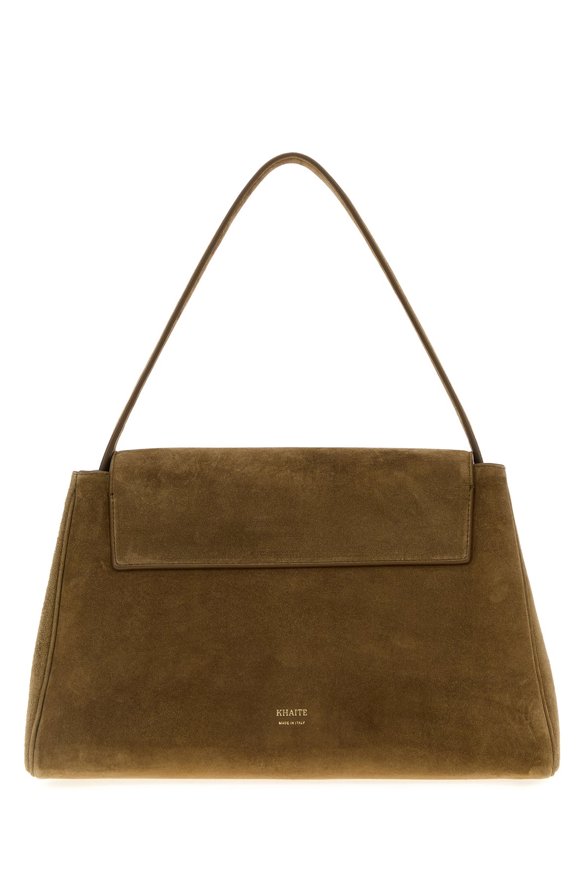 Handbag realized in suede characterized by laminate printed logo at the back.