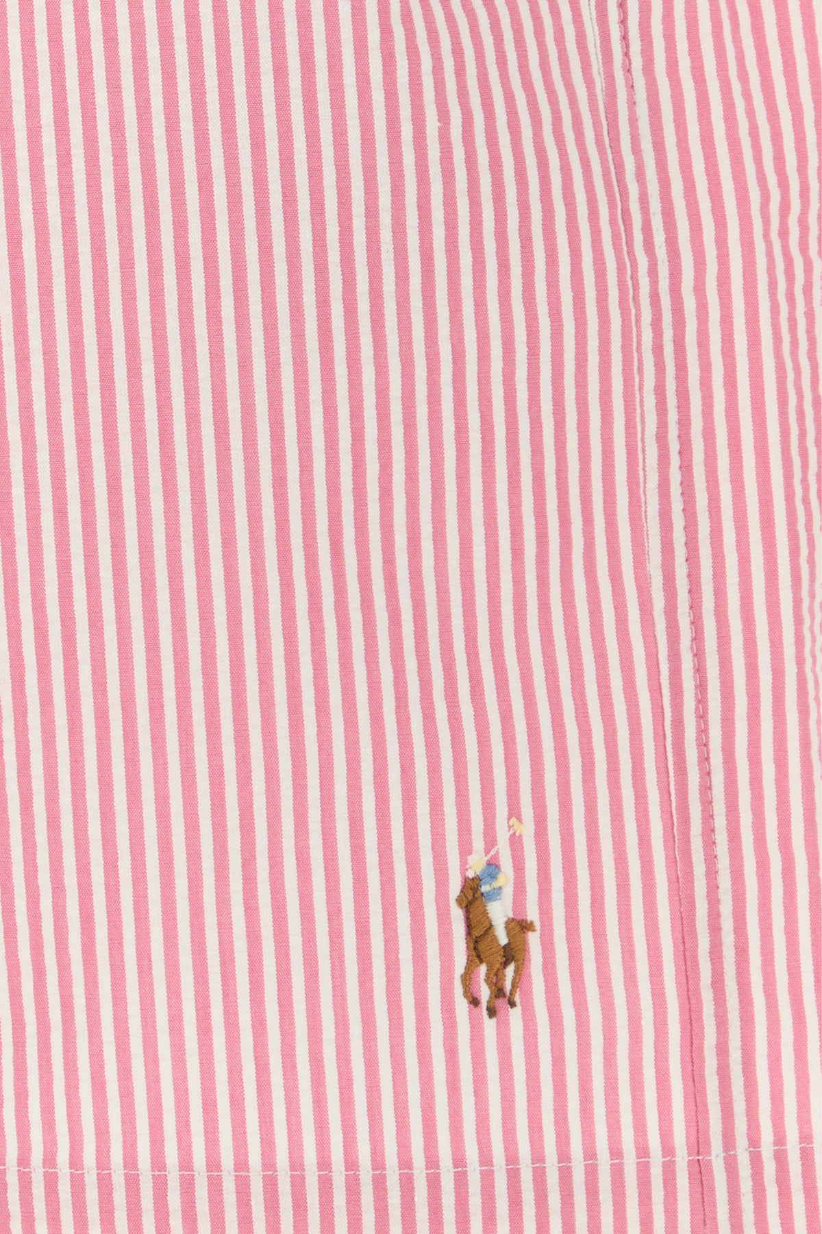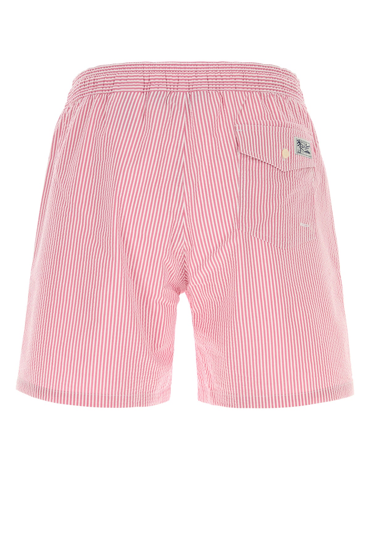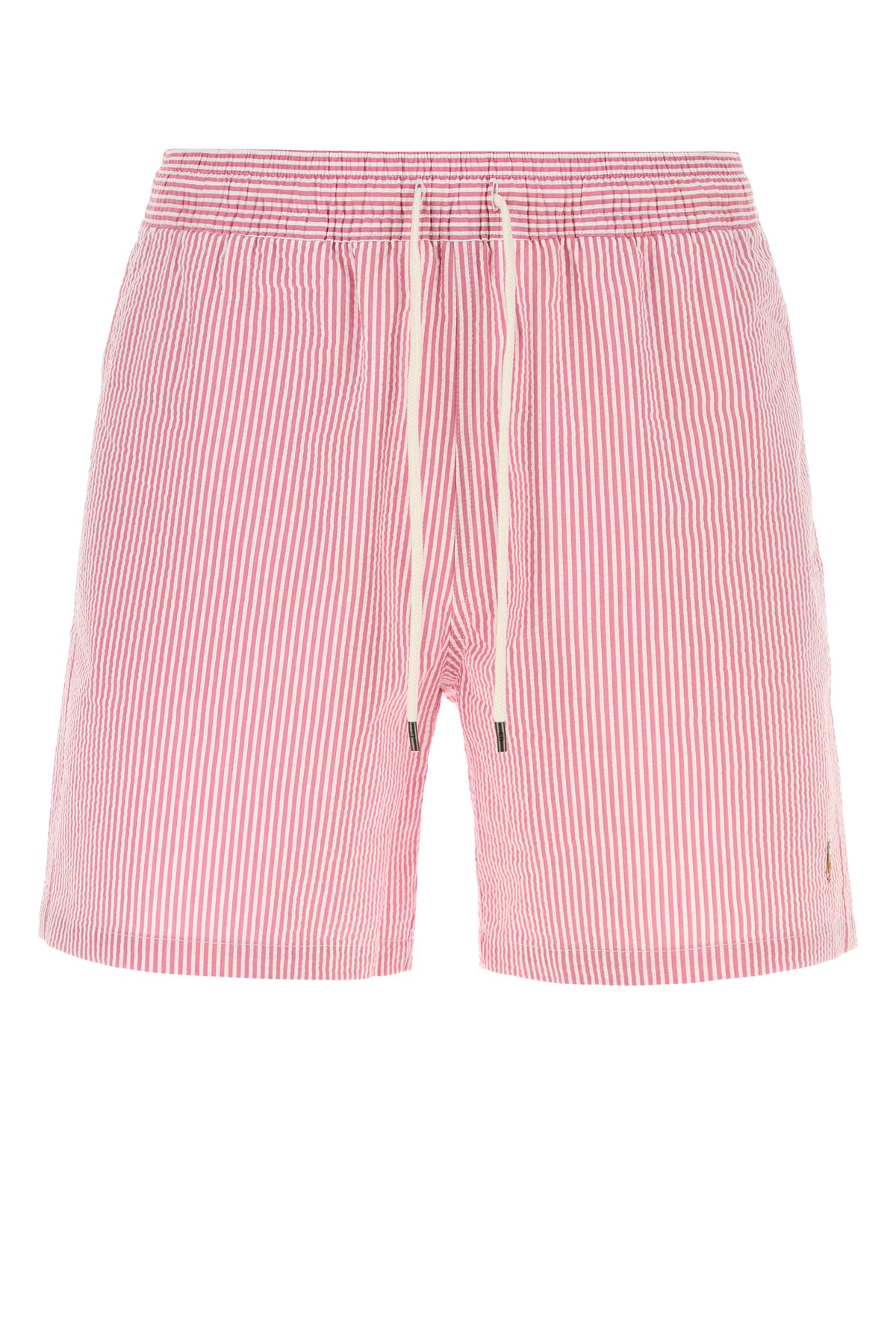 Swimming shorts realized in stretch cotton blend characterized by striped embroidery on the entire surface and iconic embroidered logo on the hemline enriched by logoed label at the back.