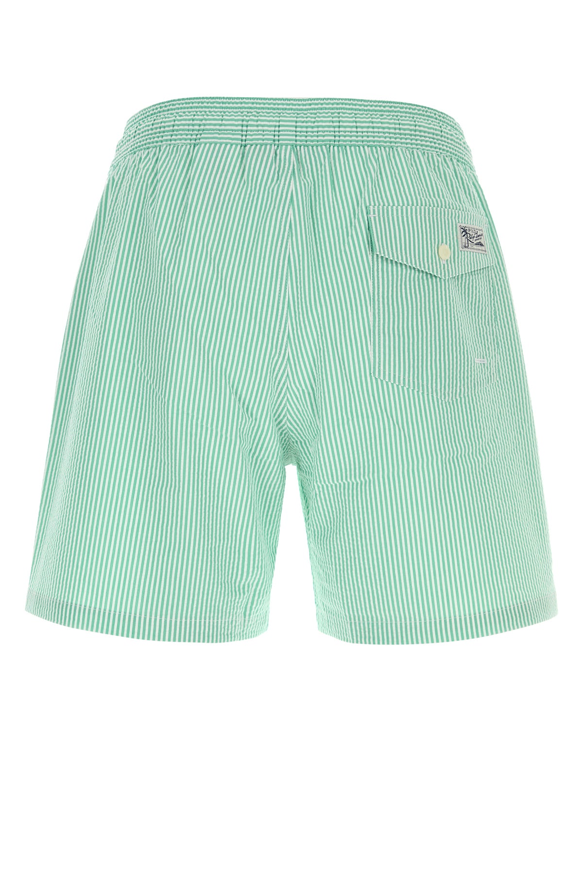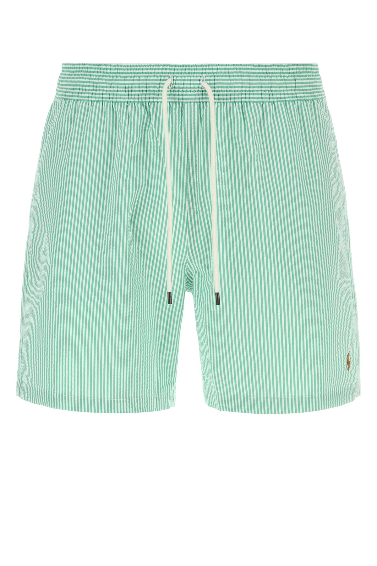 Swimming shorts realized in stretch cotton blend characterized by striped embroidery on the entire surface and iconic embroidered logo on the hemline enriched by logoed label at the back.