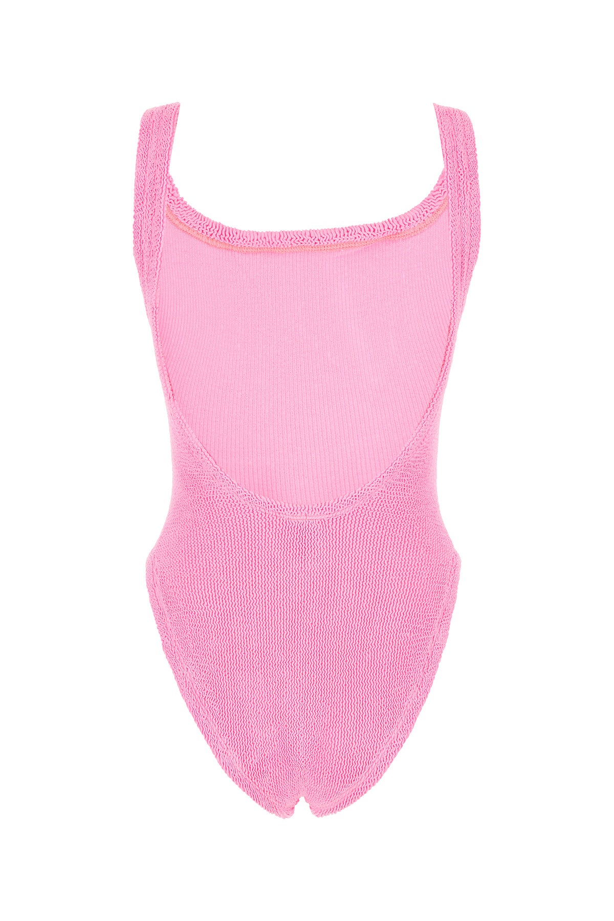 Swimsuit realized in embossed stretch nylon characterized by open back.