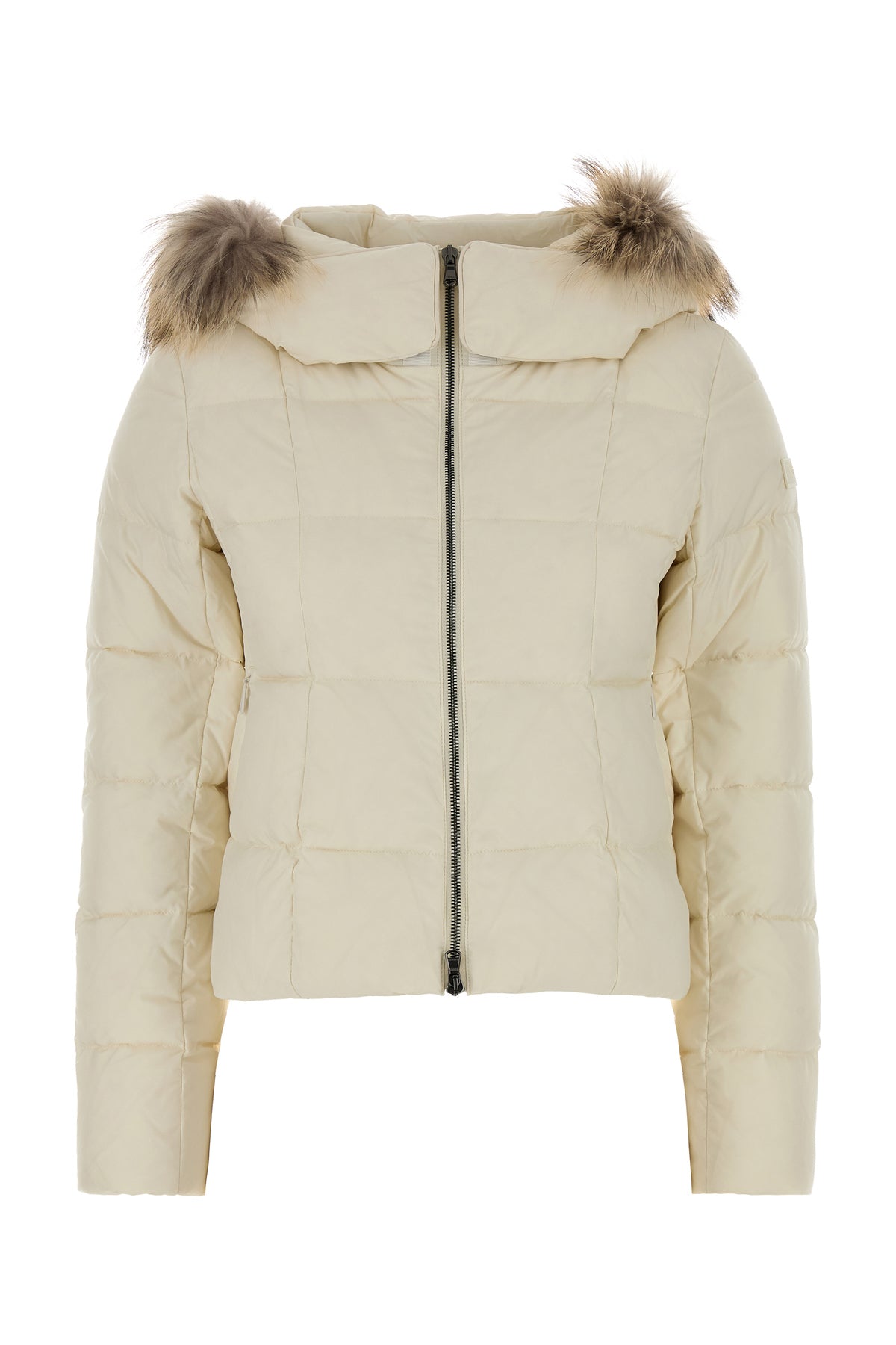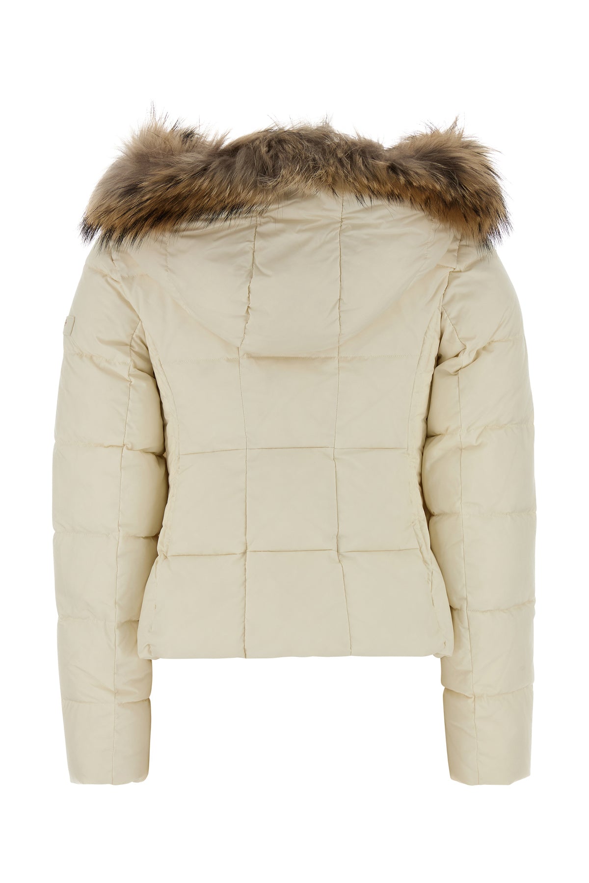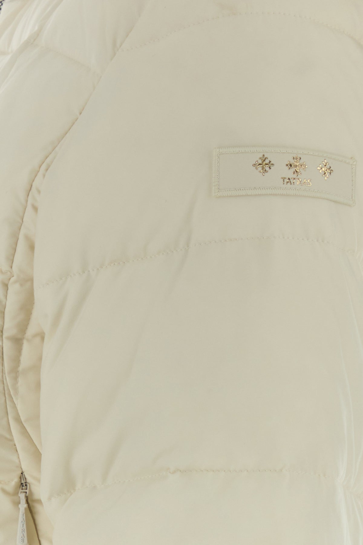 Down jacket realized in quilted nylon enriched by tonal logoed label on the sleeve.
