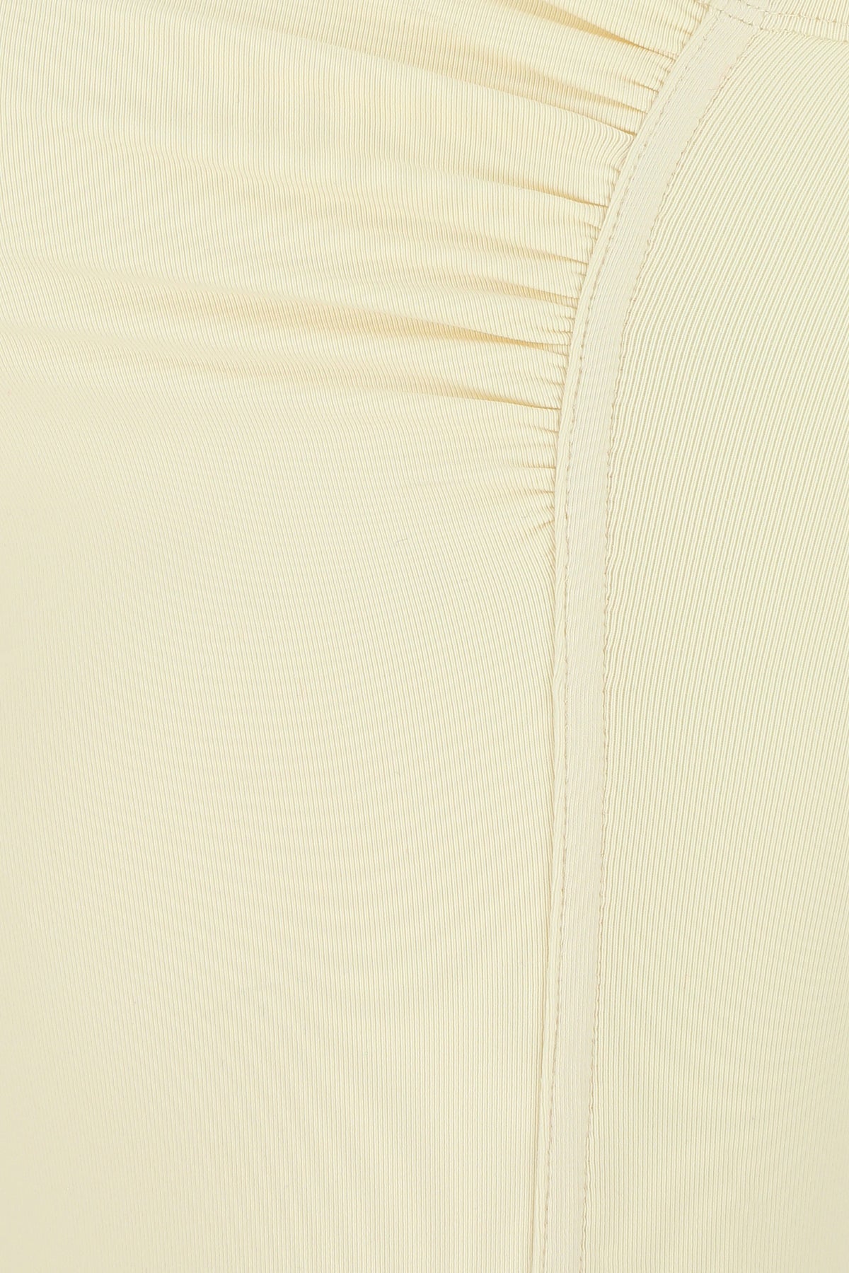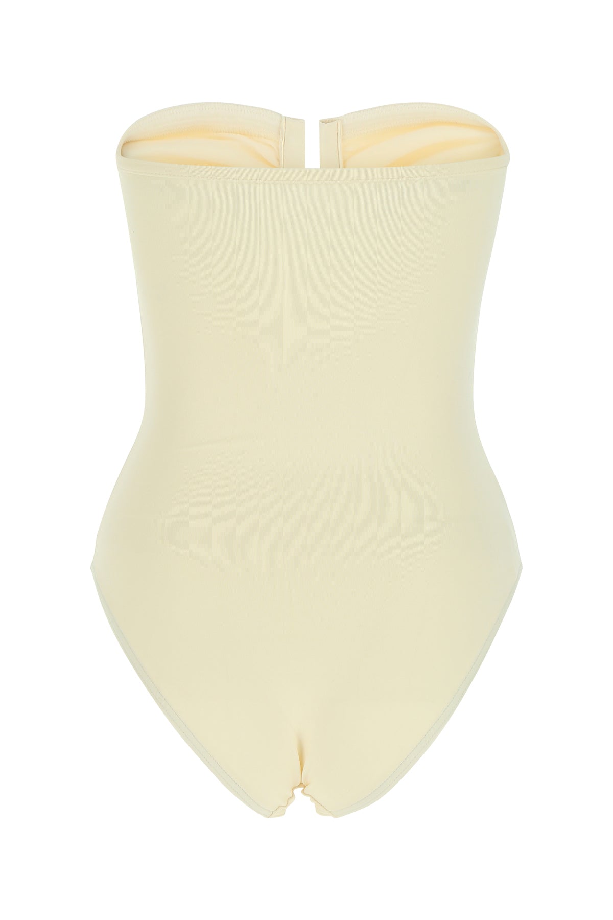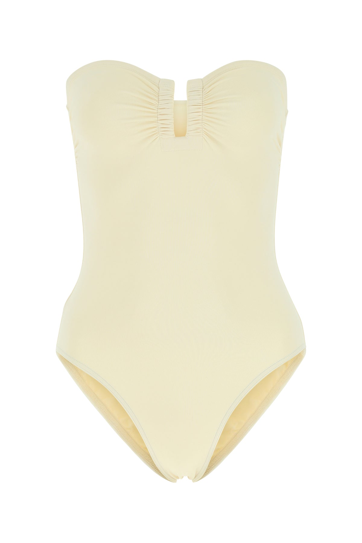 Swimsuit realized in stretch nylon characterized by peculiar gathered neckline with metal detail.