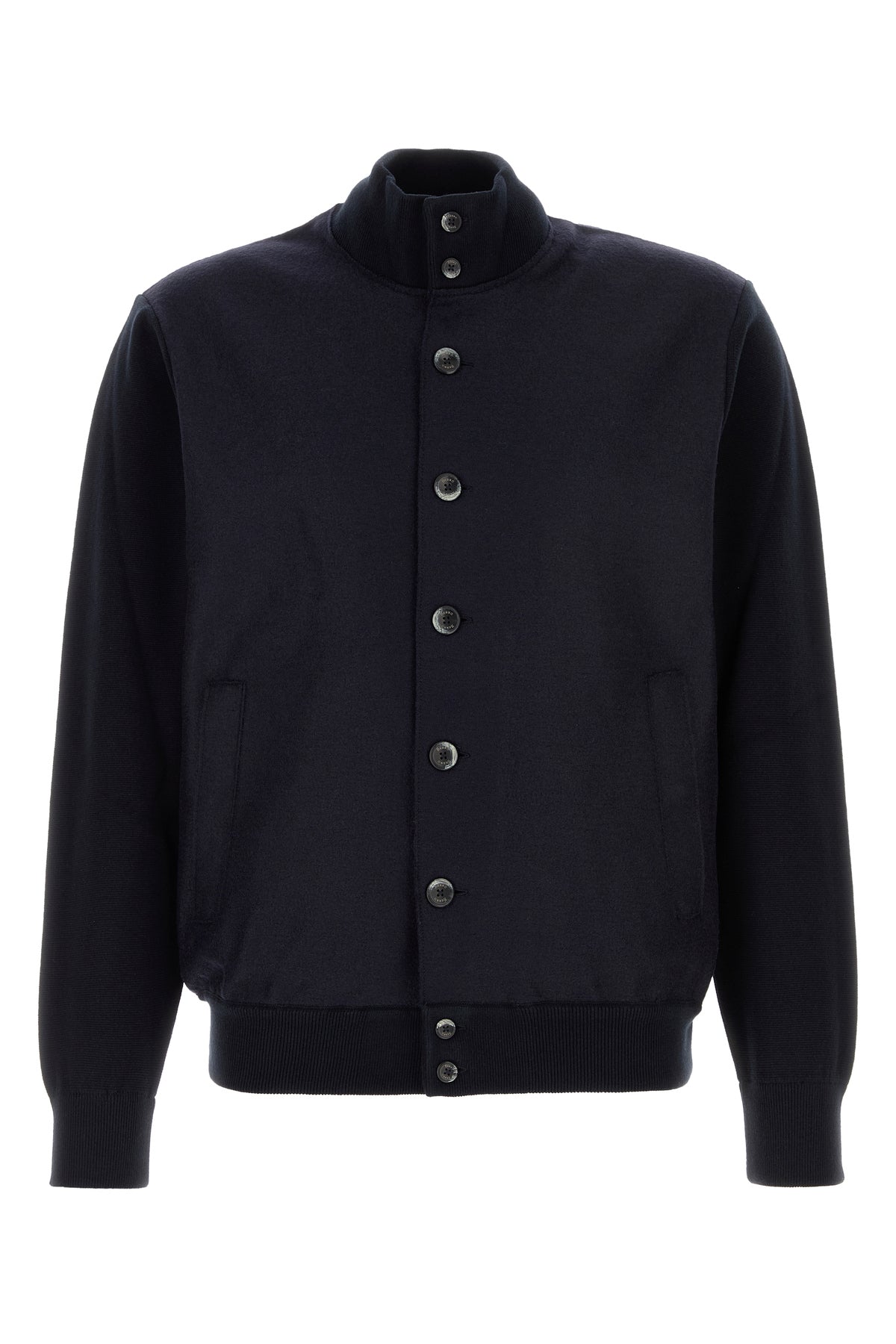 Cardigan realized in cotton and cashmere with virgin wool insert at the front enriched by logoed metal plate at the back.