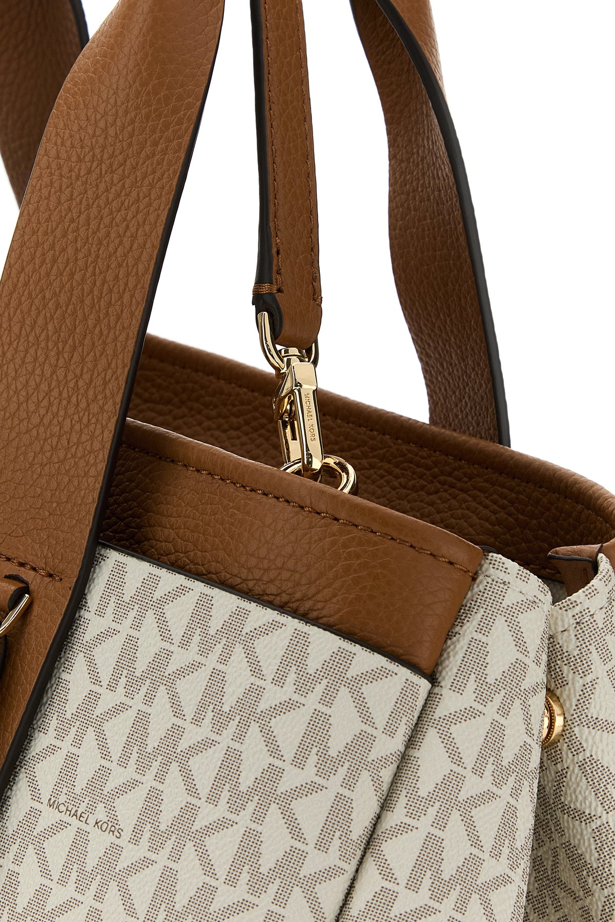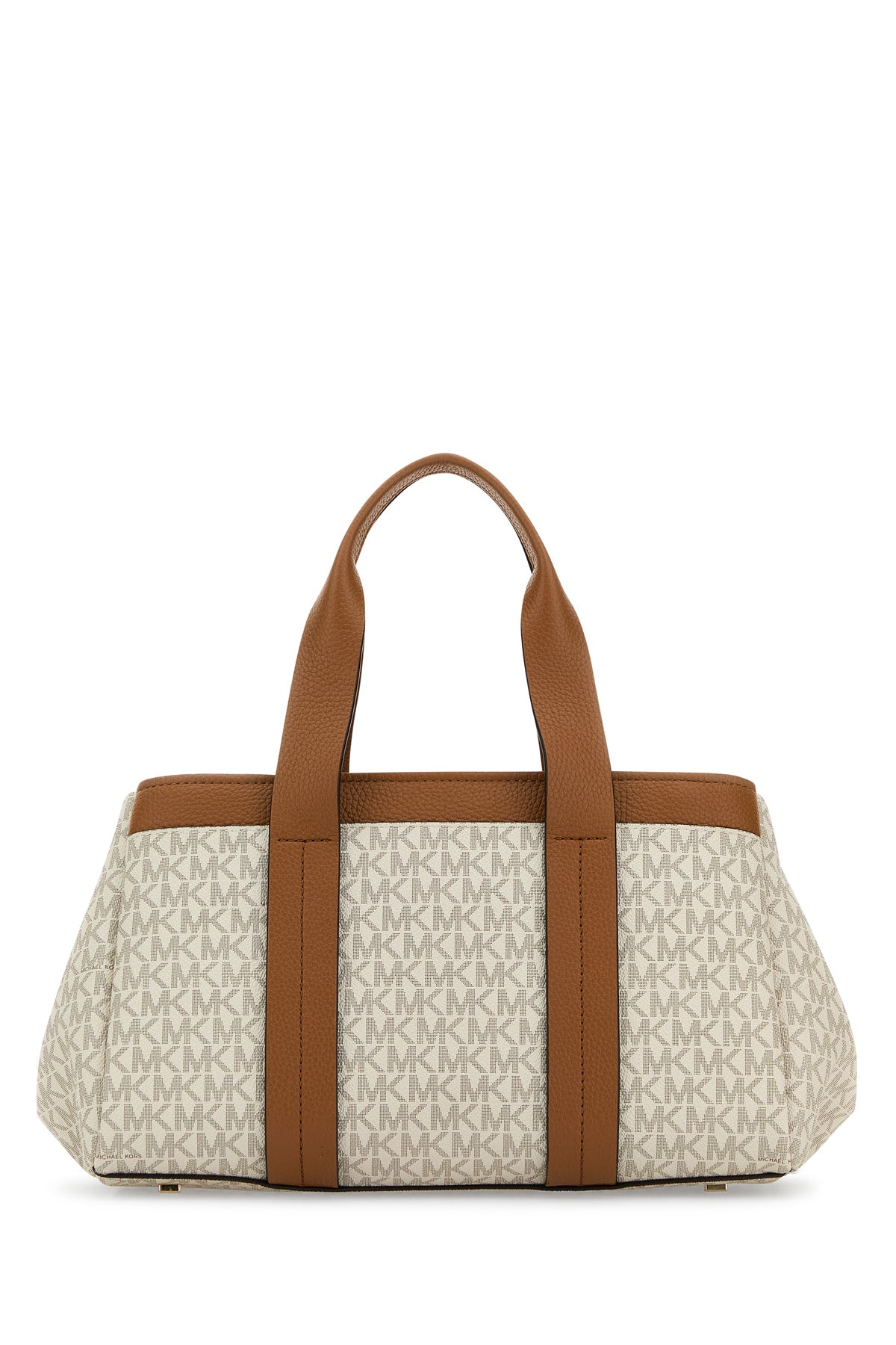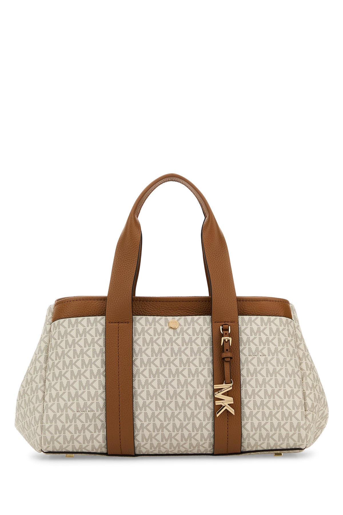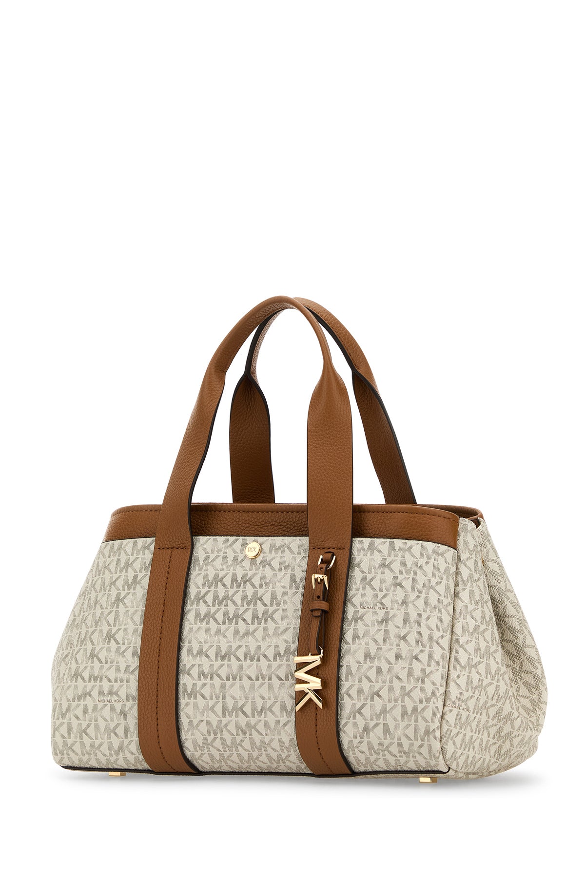 Handbag realized in coated canvas characterized by printed logo on the entire surface.