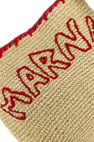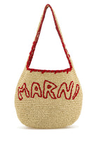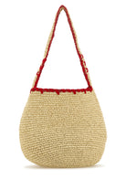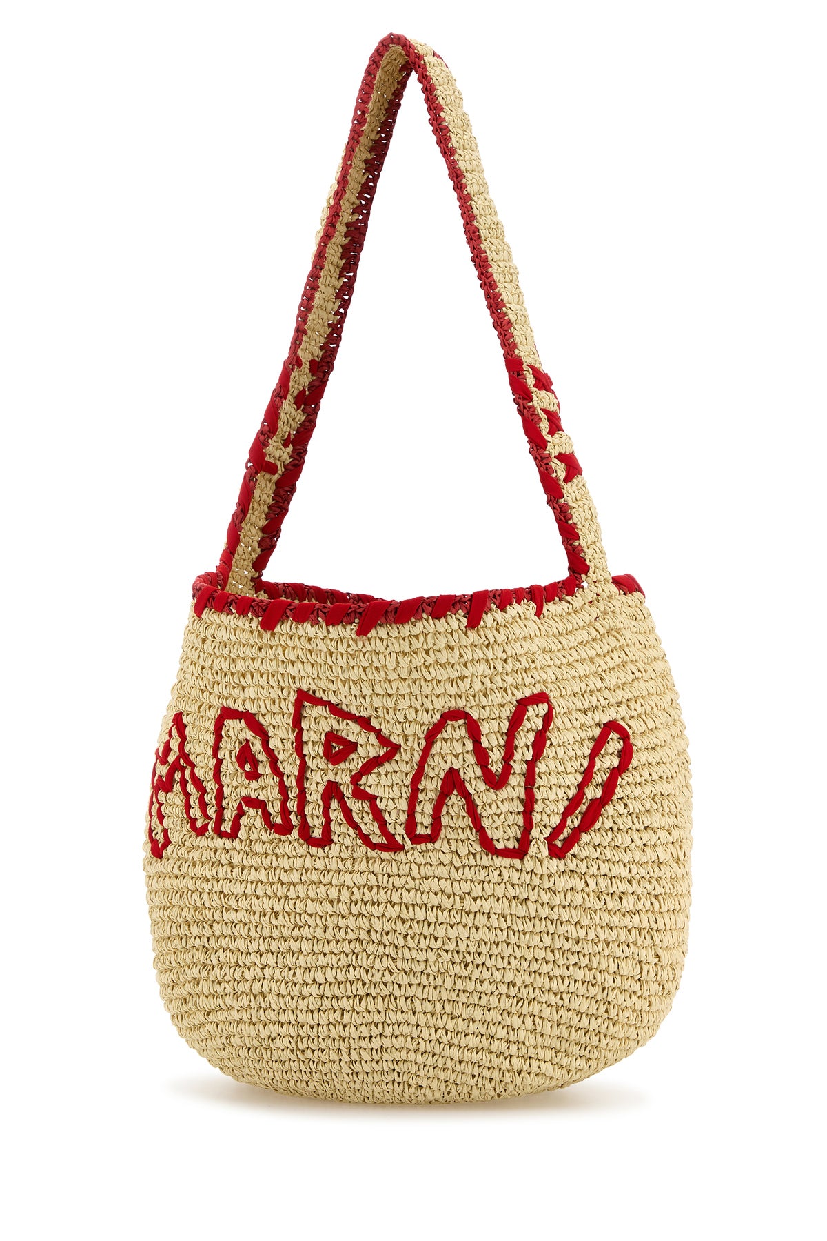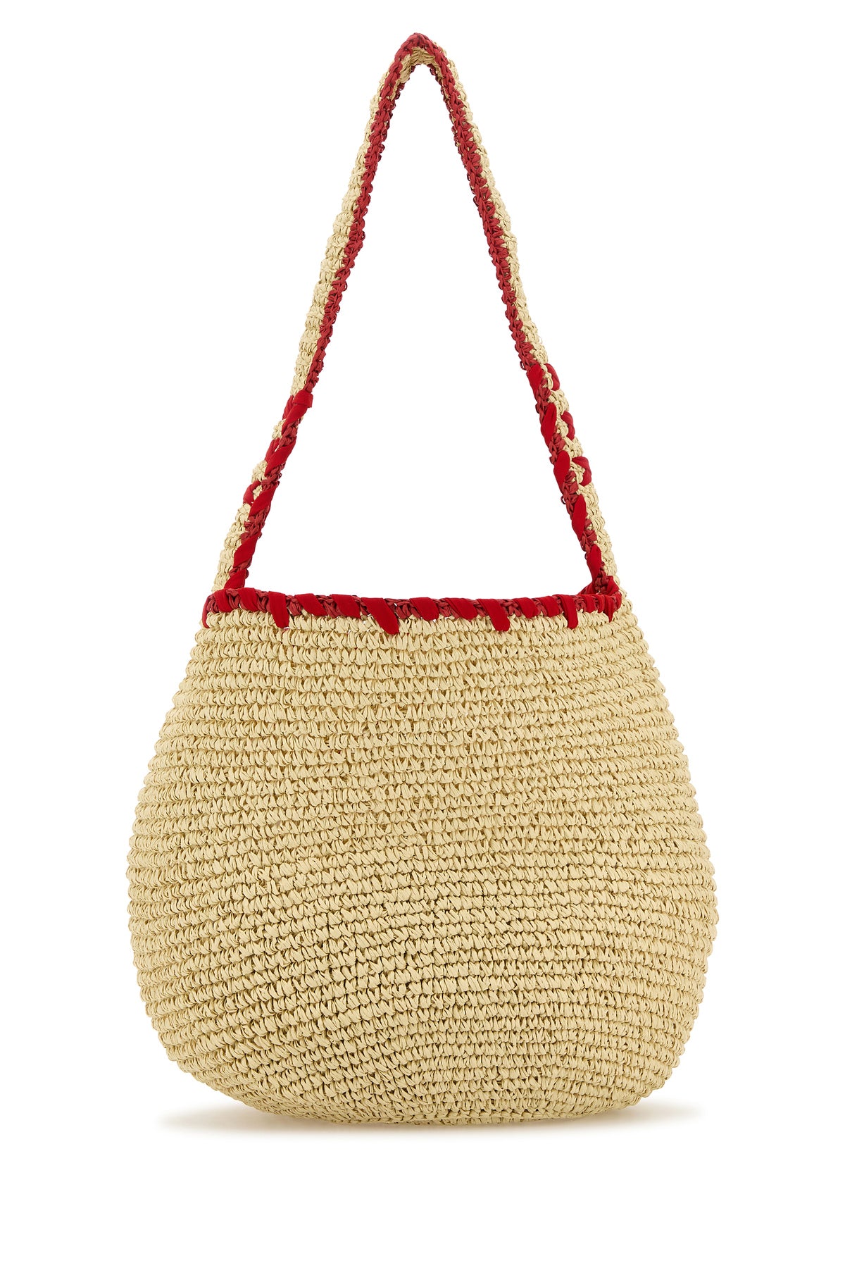 Shopping bag realized in raffia characterized by contrasting embroidered logo a the front.