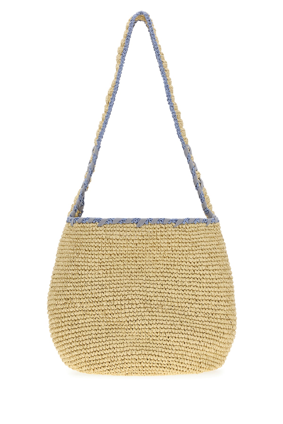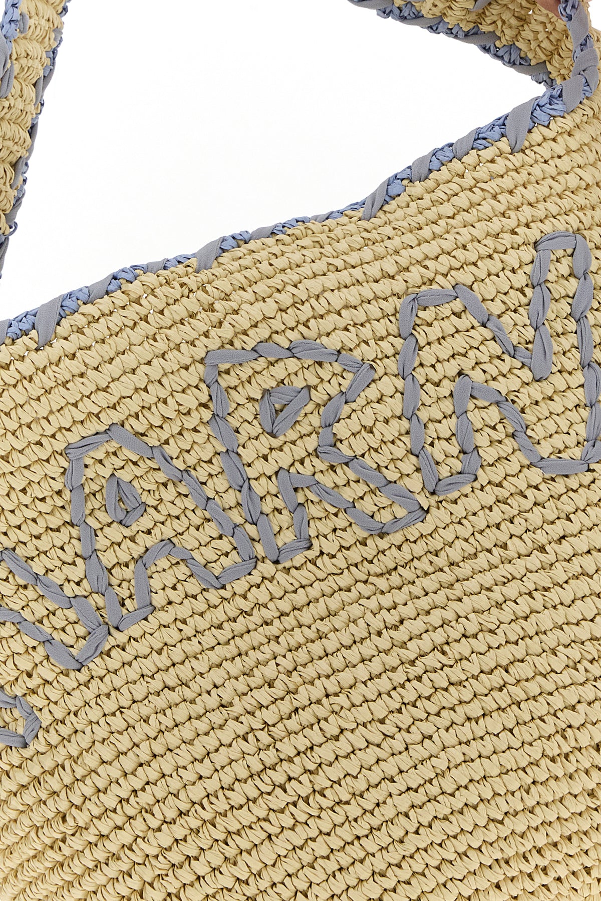 Shopping bag realized in raffia characterized by contrasting embroidered logo a the front.