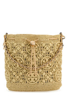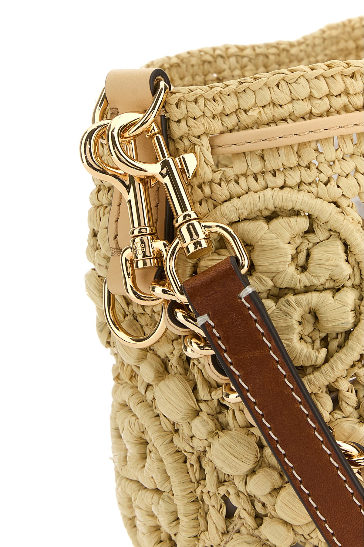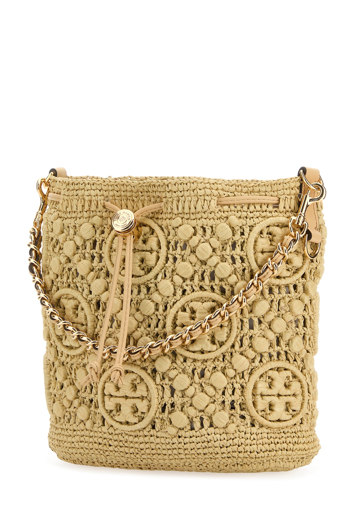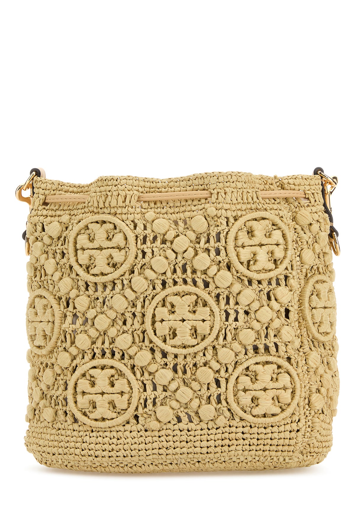 Bucket bag realized in raffia characterized by T Monogram embroidery on the entire surface drawstring closure with metal logoed detail.