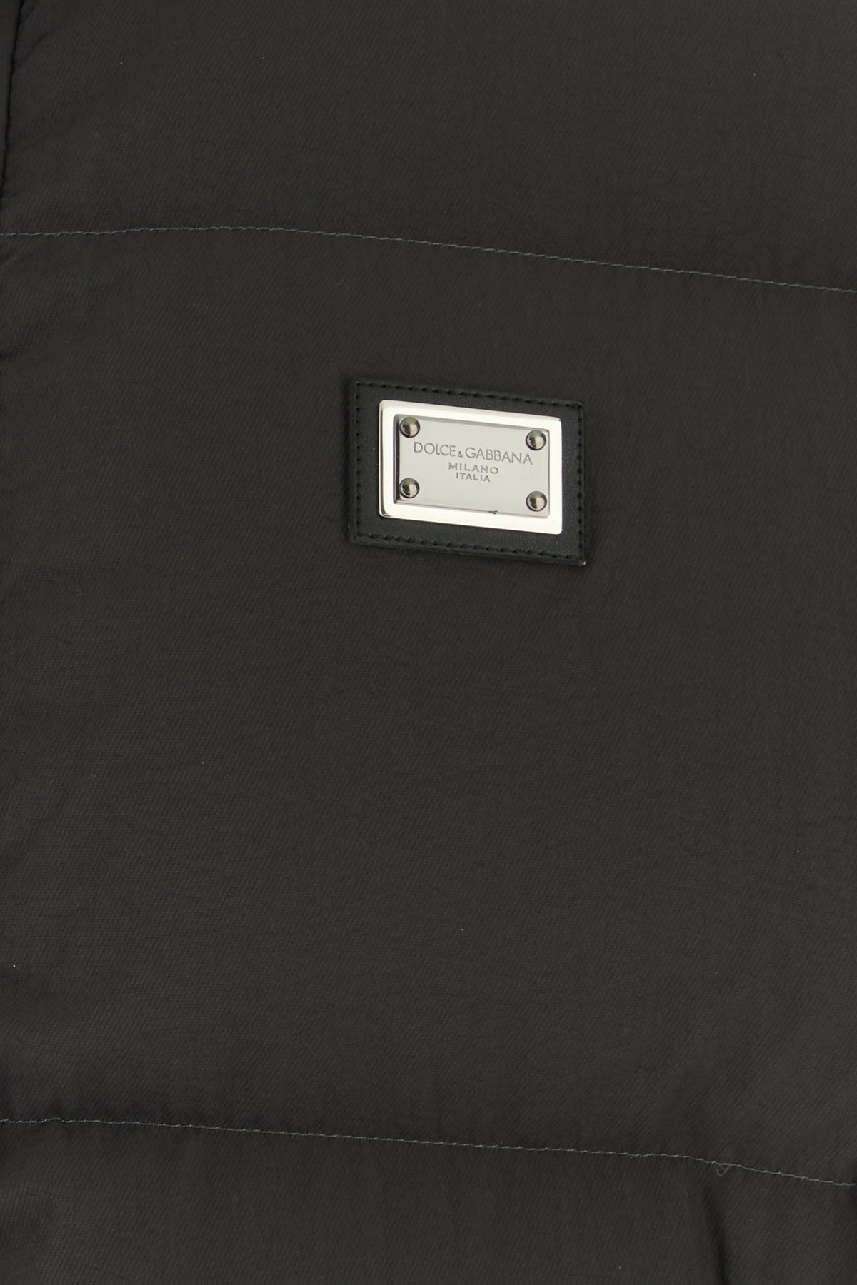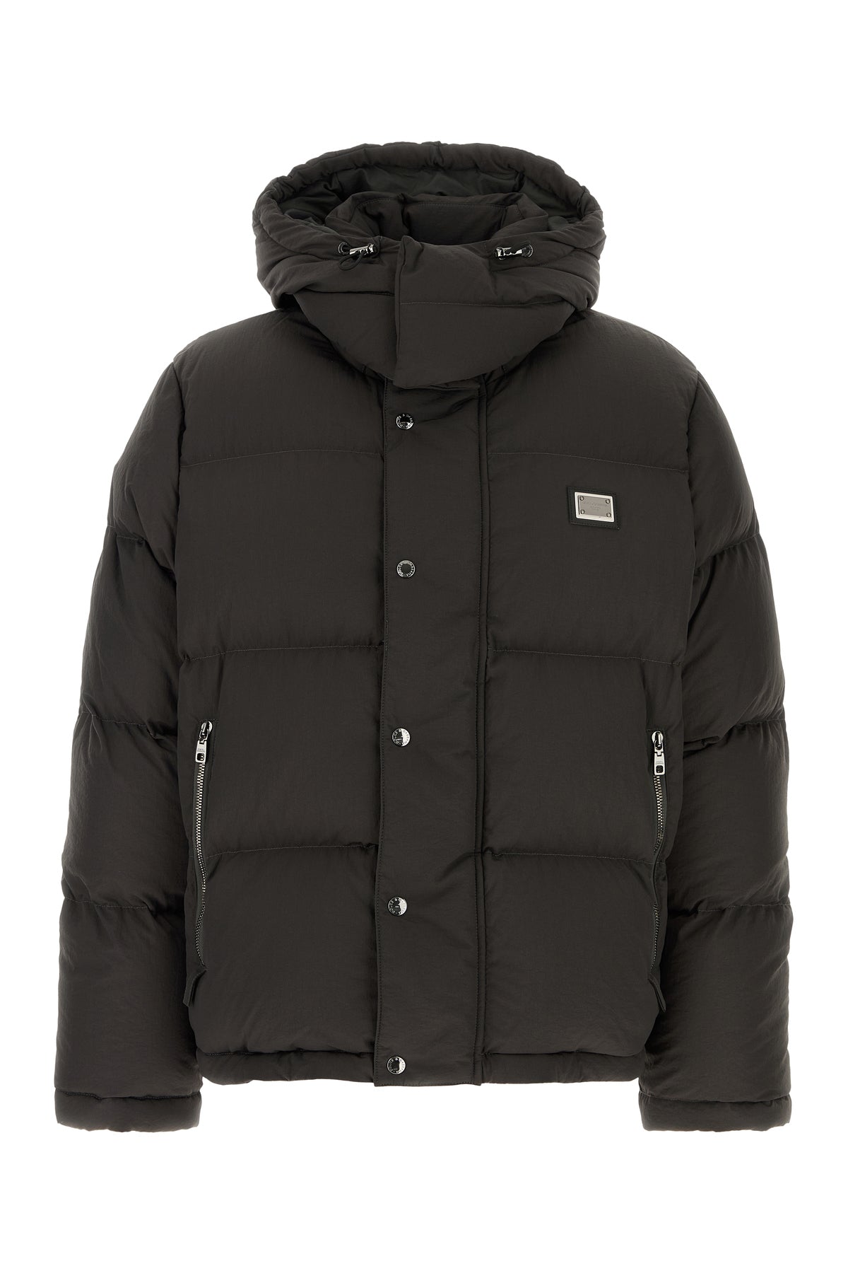 Down jacket realized in nylon blend enriched by logoed metal plate on the chest.
