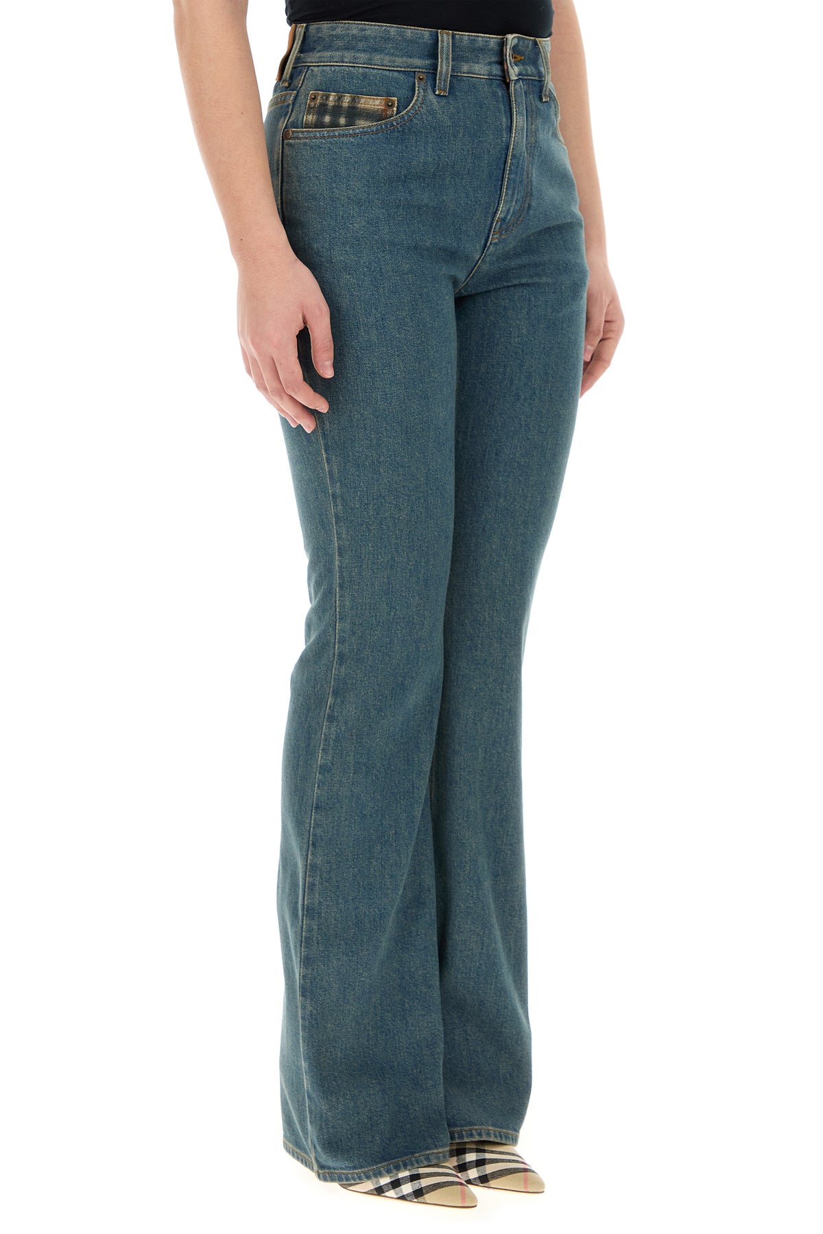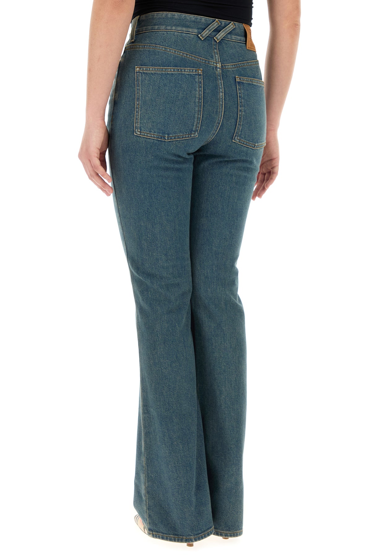 Flared leg jeans realized in stonewashed stretch cotton denim enriched by logoed label on the hemline.