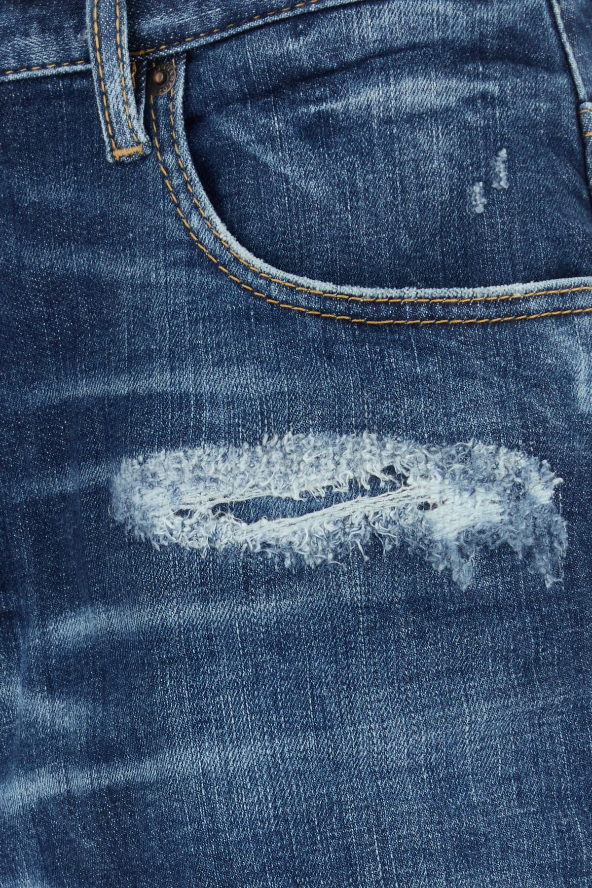 Jeans realized in stonewashed and distressed stretch denim enriched by logoed label at the back.