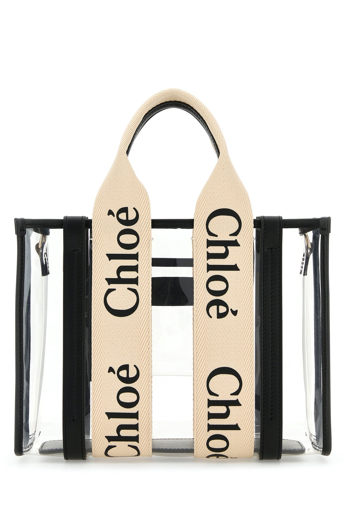 Shopping bag realized in rubber with smooth calf leather inserts enriched by logoed canvas bands at the front and at the back.