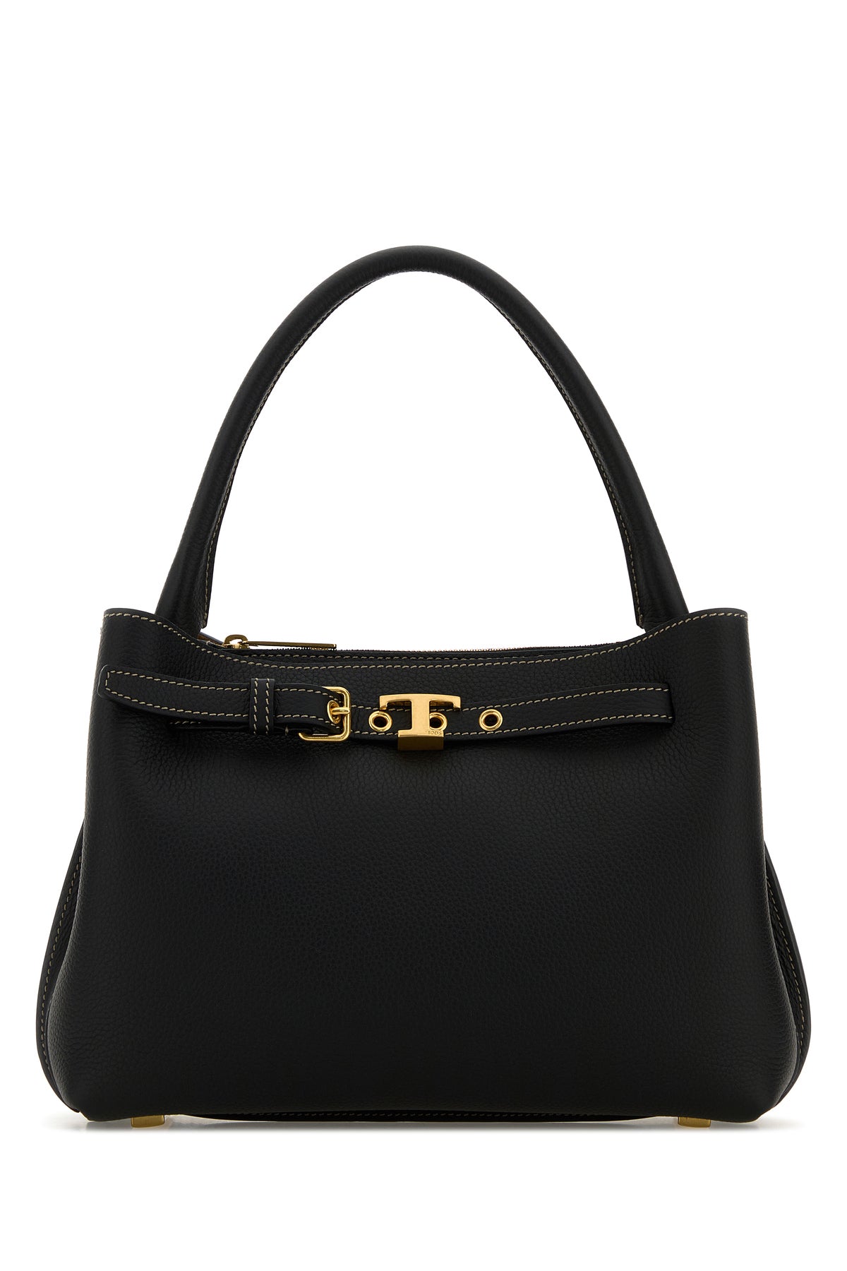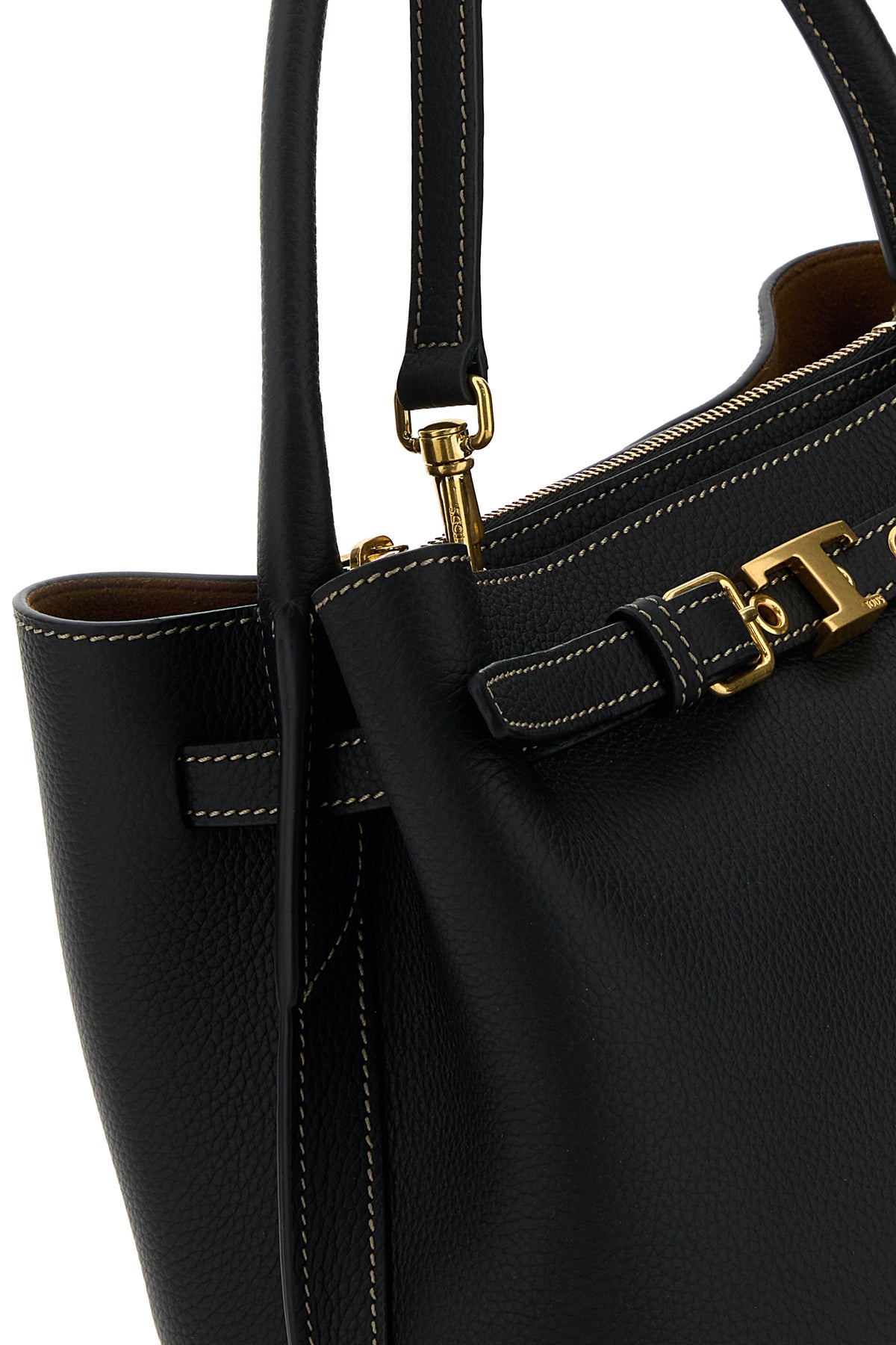 Handbag realized in pebble leather enriched by logoed metal detail on the adjustable strap at the top.