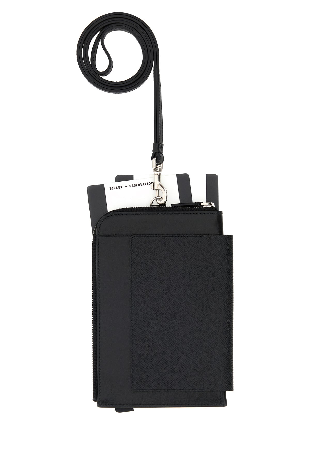 Phone holder realized in pebble leather characterized by peculiar logoed print at the front.