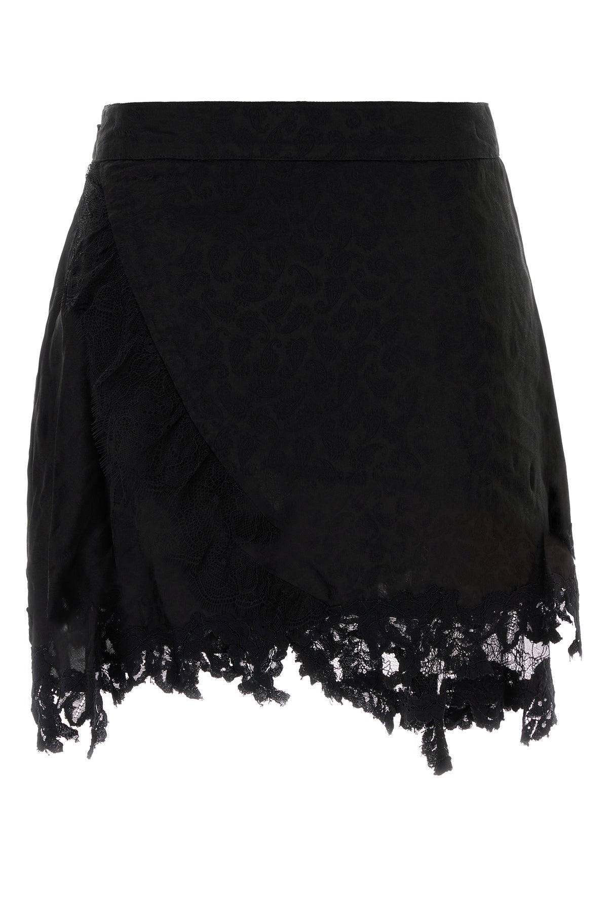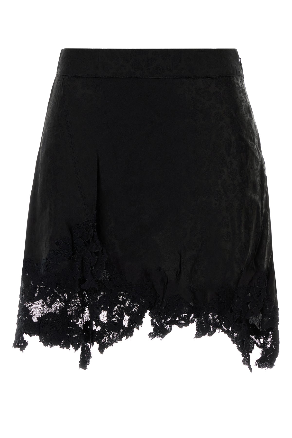 Asymmetric mini skirt realized in satin with lace insert on the hemline characterized by tonal paisley embroidery on the entire surface.