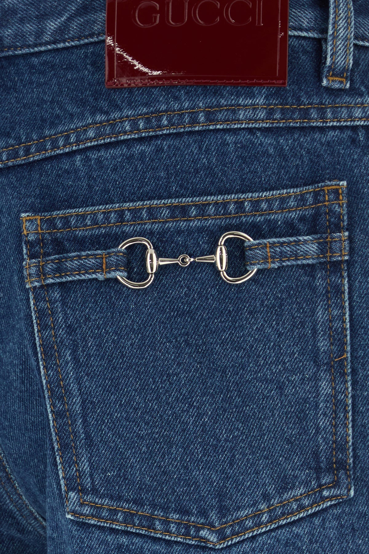 Jeans realized in pure cotton denim enriched by Horsebit metal detail at the back.